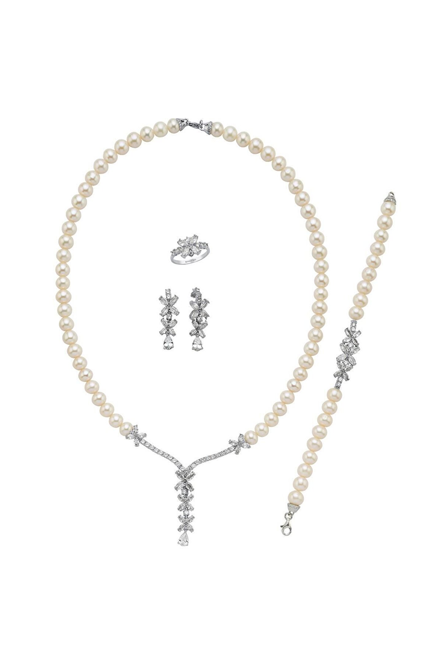 925 Ayar Gümüş Kadın Çiçek Modelli Zirkon Taşlı Doğal Inci Küpe Kolye Bileklik Yüzük Dörtlü Set