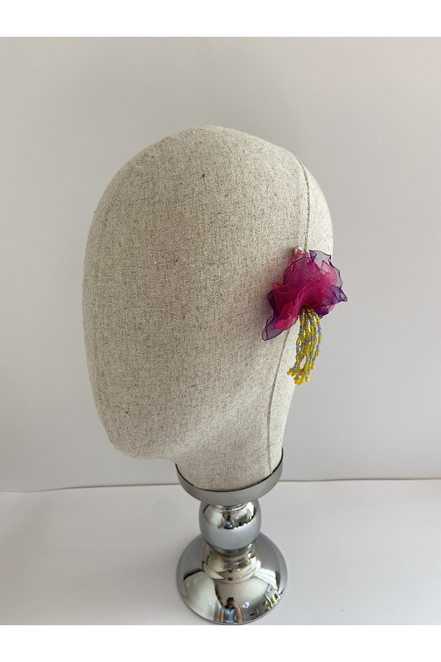 Cemil İpekçi'nin özel defilesi için tasarlanmış bu şık küpe seti, zarafeti ve modern estetiği bir araya getiriyor. Eşsiz mor ve pembe tül detayları, sarı ve gri kum boncuk sallantılarıları ile bezeli bu küpeler, göz alıcı renklerin ve dokuların harmanlanmasını sunarak her tarza mükemmel bir uyum sağlar.