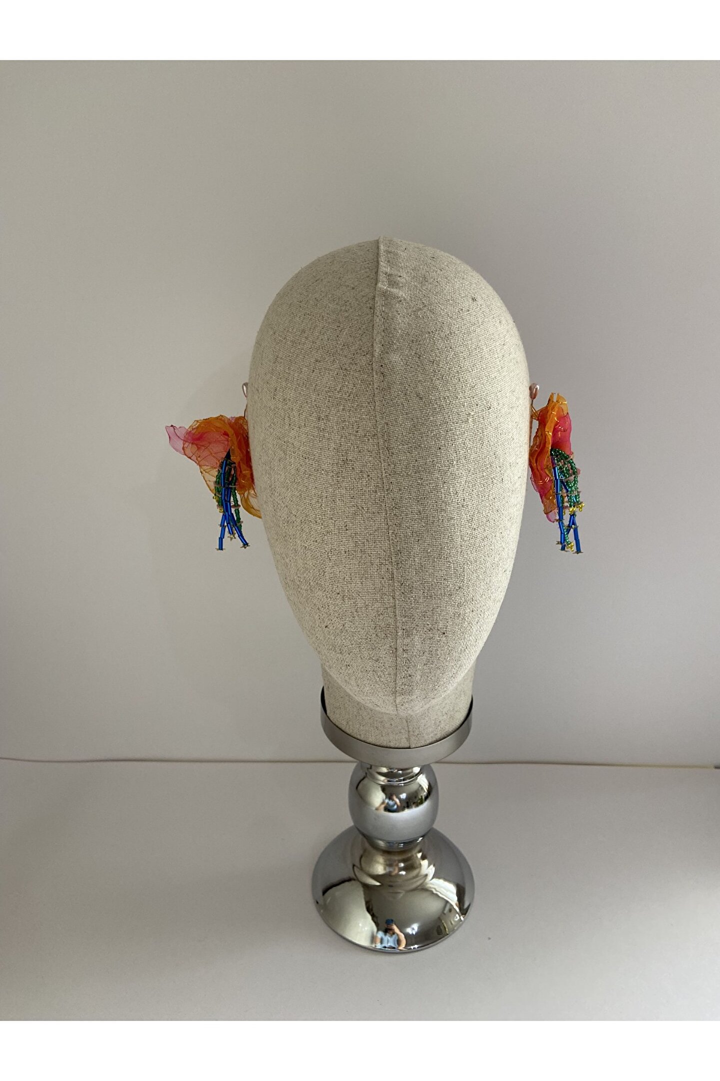 Cemil İpekçi'nin özel defilesi için tasarlanmış bu şık küpe seti, zarafeti ve modern estetiği bir araya getiriyor. Eşsiz sarı ve turuncu tül detayları, mavi ve yeşil kum boncuk sallantılarıları ile bezeli bu küpeler, göz alıcı renklerin ve dokuların harmanlanmasını sunarak her tarza mükemmel bir uyum sağlar