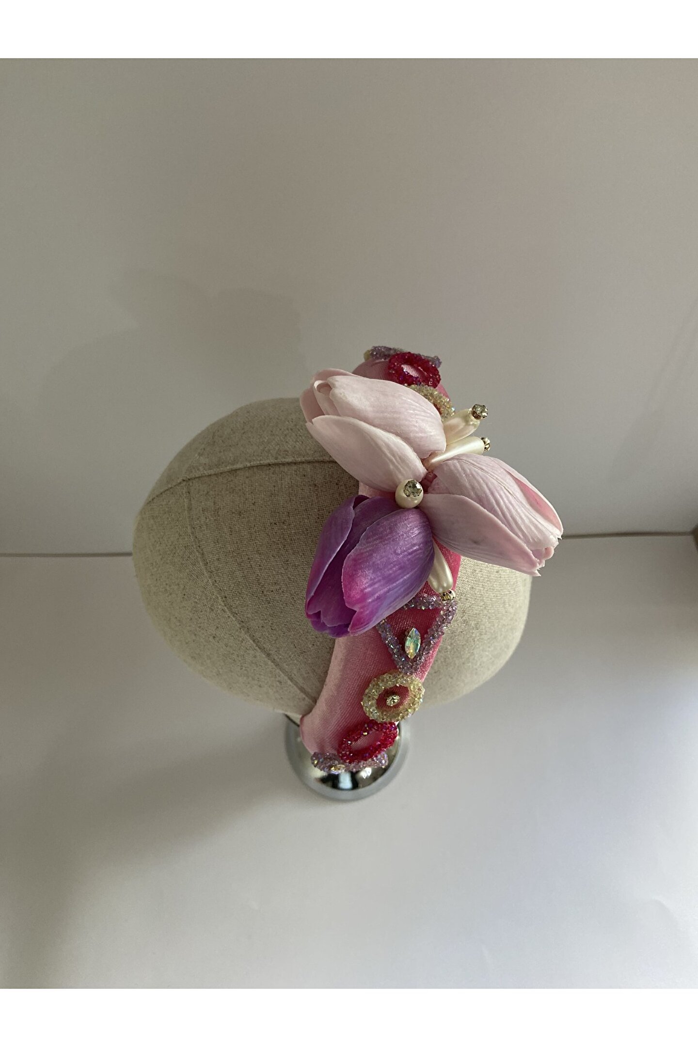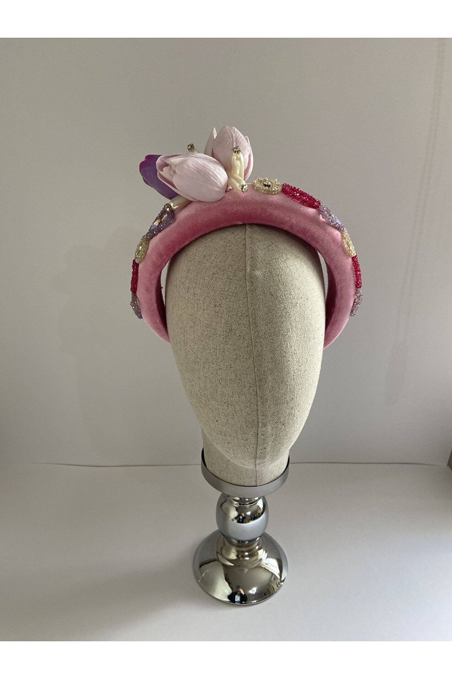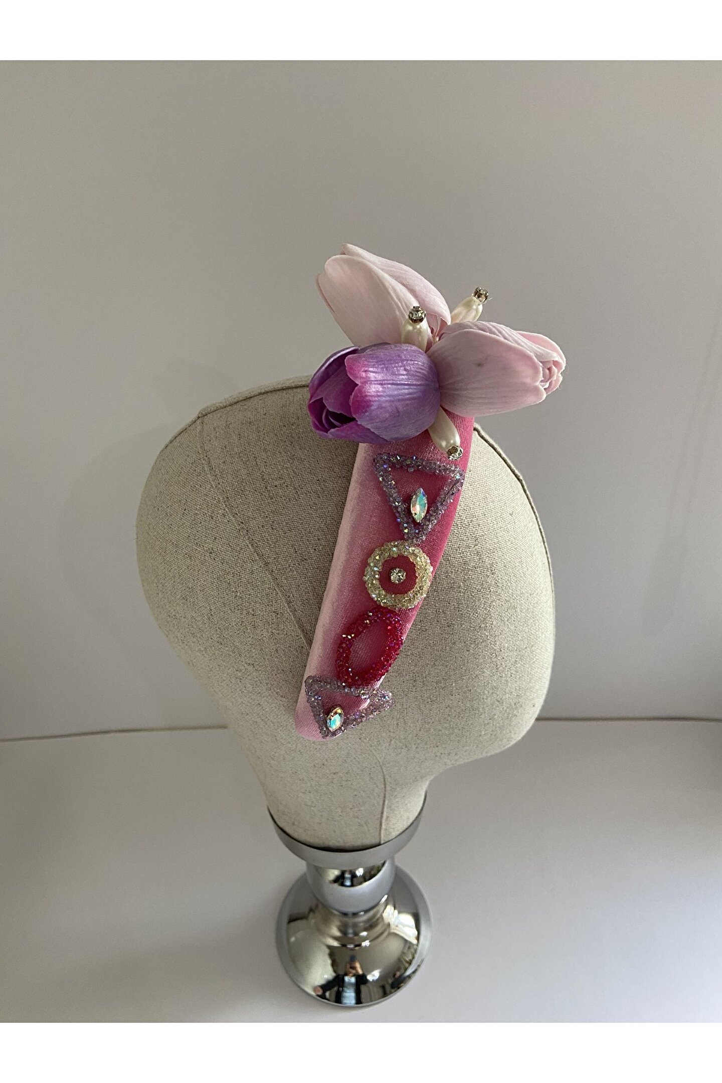 Cemil İpekçi defilesi için özel olarak tasarlanan bu zarif taç, pembe kadife kumaşıyla şıklığı ve zarafeti bir araya getiriyor. Bir tarafında çiçek motifi ve parlak detaylar, diğer tarafında ise cam ve ışıltılı boncuklarla yapılan işlemelerle süslenmiştir. Özel günlerde veya günlük kullanımlarda stilinize şıklık katacak bu taç, her tarza uyum sağlayarak dikkatleri üzerinize çekecek. Kendinizi özel hissetmek için ideal bir aksesuar!