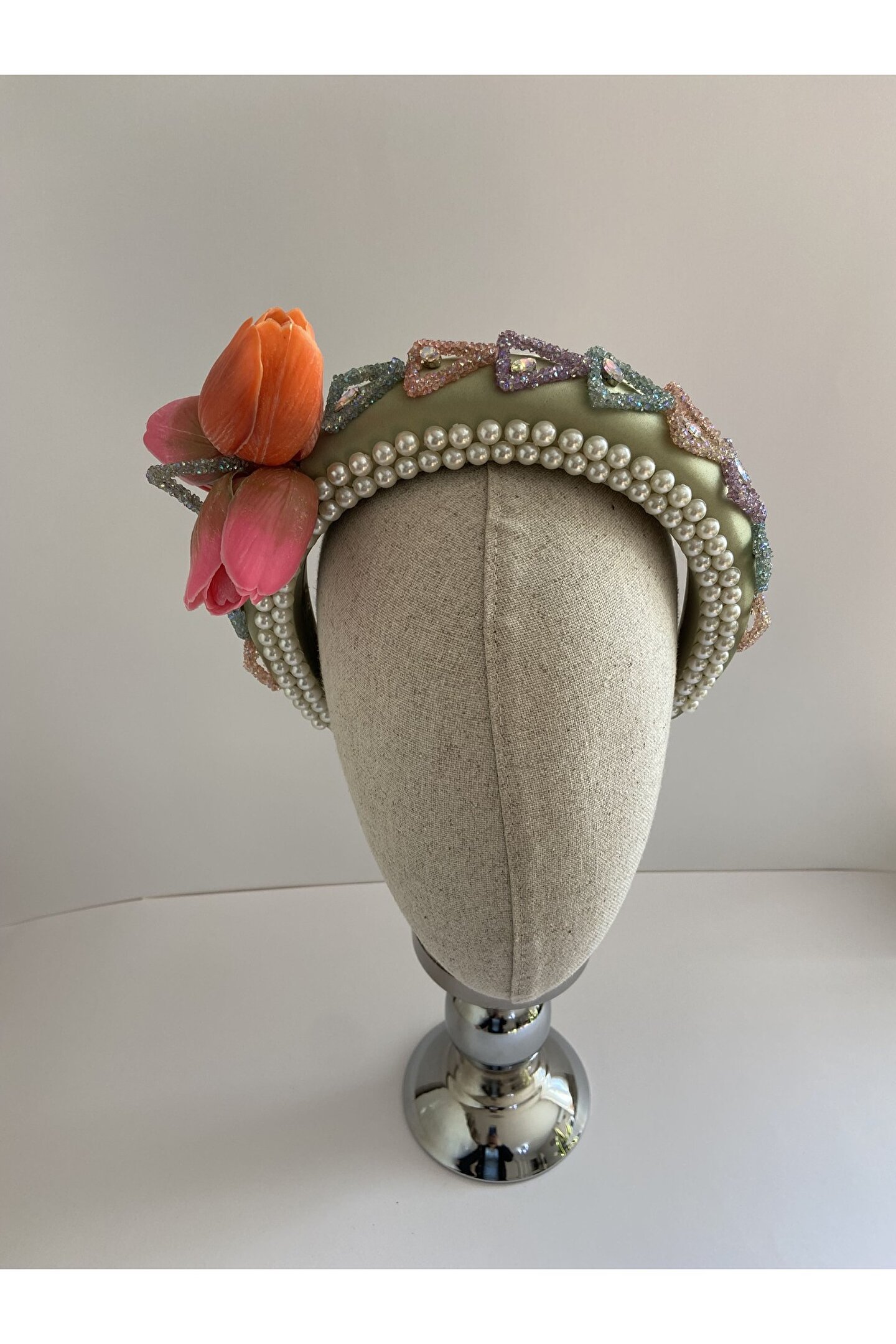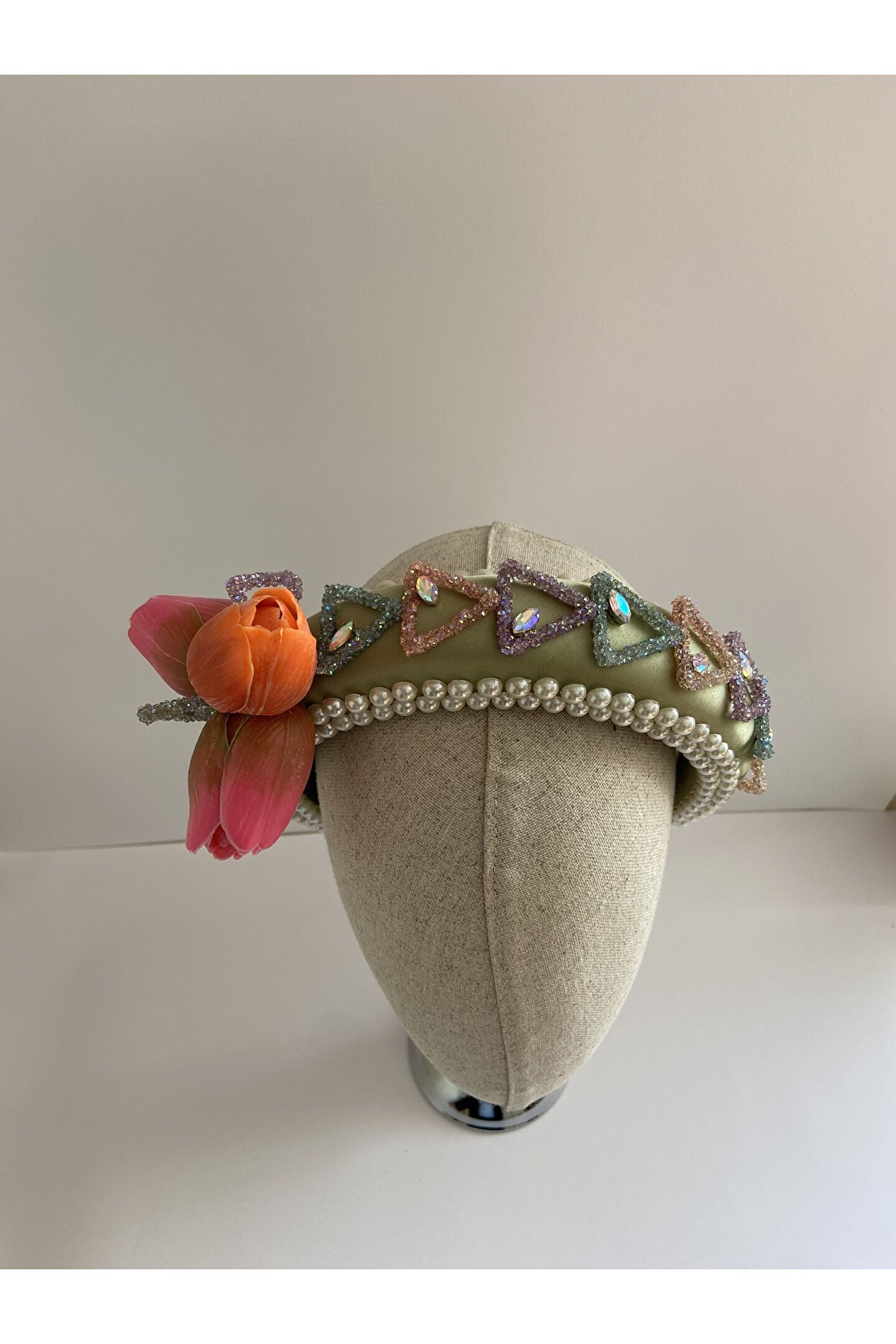 Cemil İpekçi defilesi için özel olarak tasarlanan bu zarif taç, soft yeşil kadife kumaşıyla şıklığı ve zarafeti bir araya getiriyor. Bir tarafında pembe çiçek motifi ve parlak detaylar, diğer tarafında ise cam ve ışıltılı boncuklarla yapılan işlemelerle süslenmiştir. Özel günlerde veya günlük kullanımlarda stilinize şıklık katacak bu taç, her tarza uyum sağlayarak dikkatleri üzerinize çekecek. Kendinizi özel hissetmek için ideal bir aksesuar!
