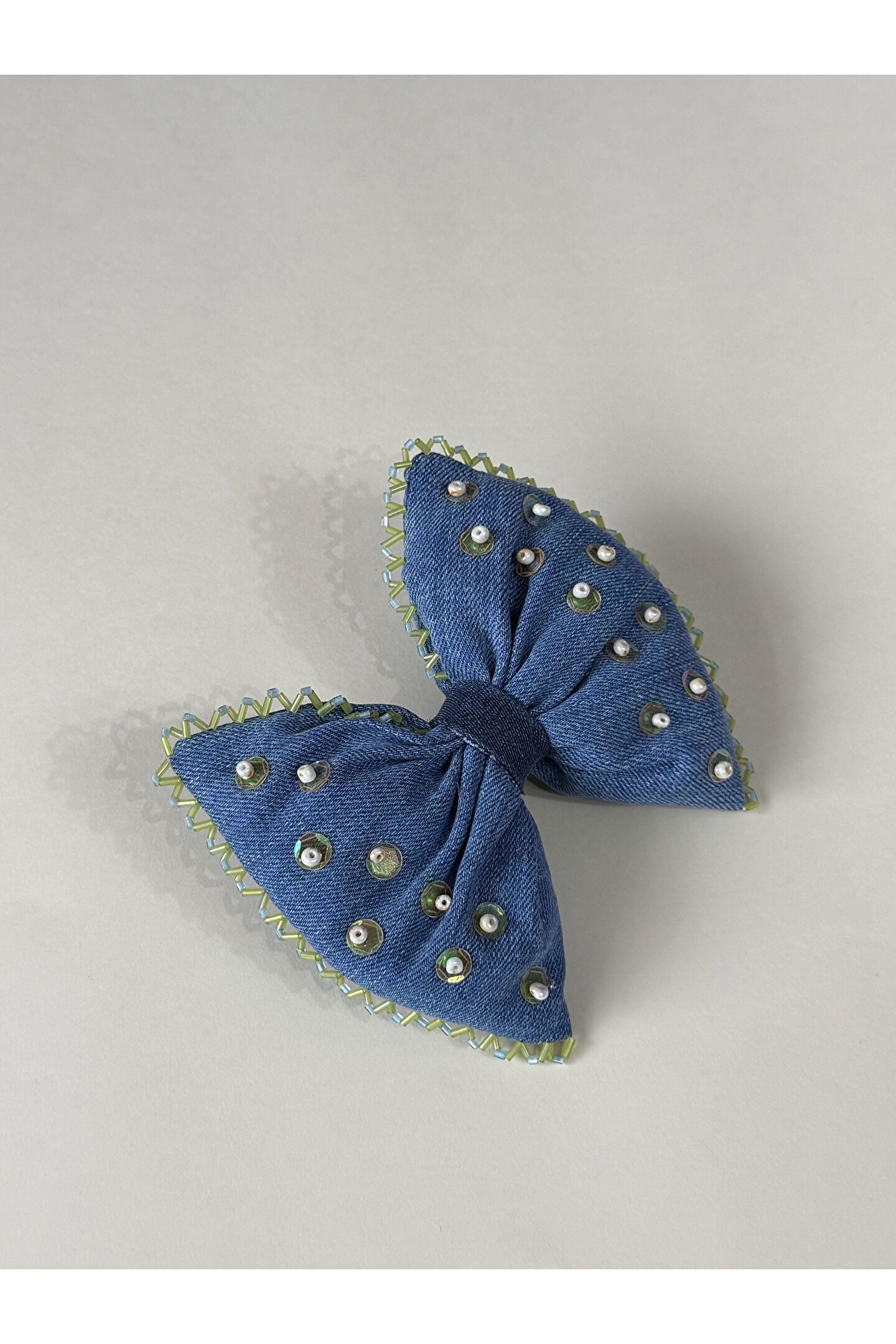 • Kumaş üzerine cam ve kum boncuk işlemeli özel tasarım otomatik fiyonk toka.