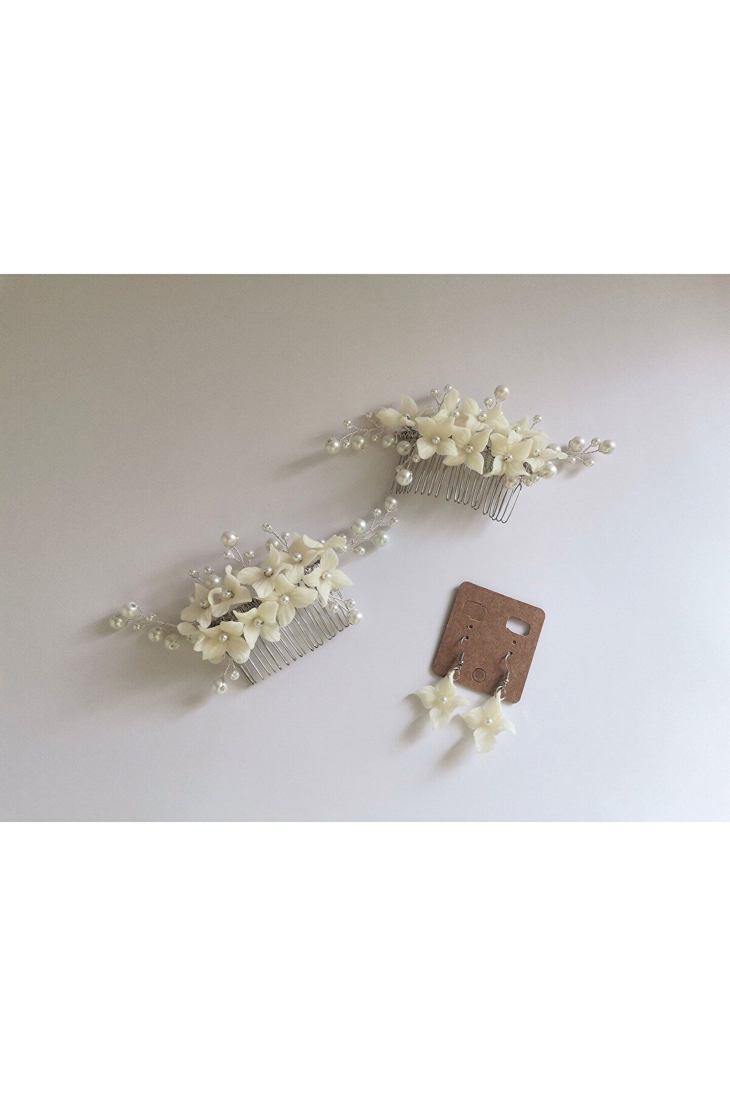 • Çiçek taneleri ve inci boncuklar ile hazırlanmış özel tasarım saç tarağı ve küpe seti.