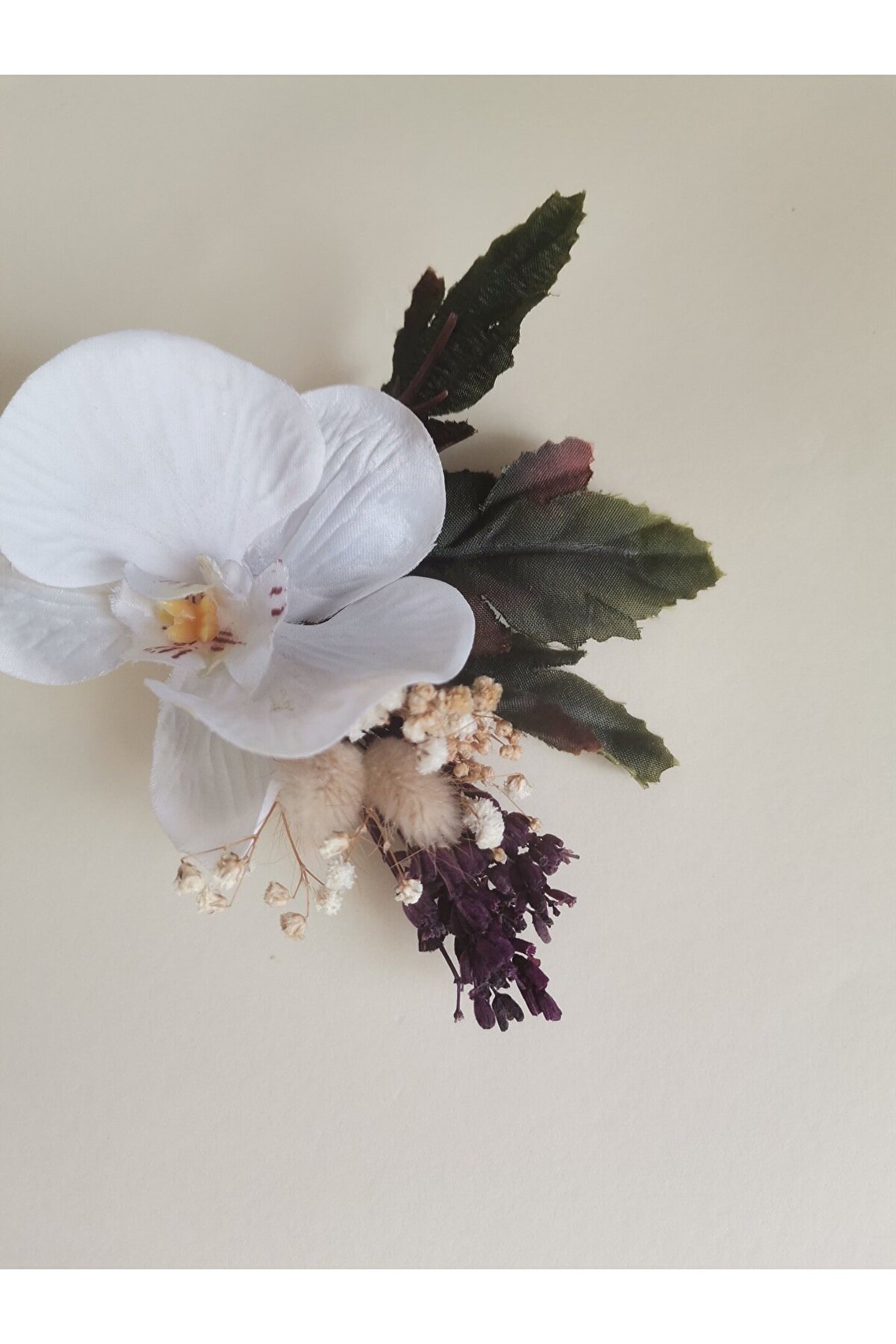 • İthal malzemeler ile hazırlanan özel tasarım damat yaka çiçeği. Beyaz-yeşil-mor