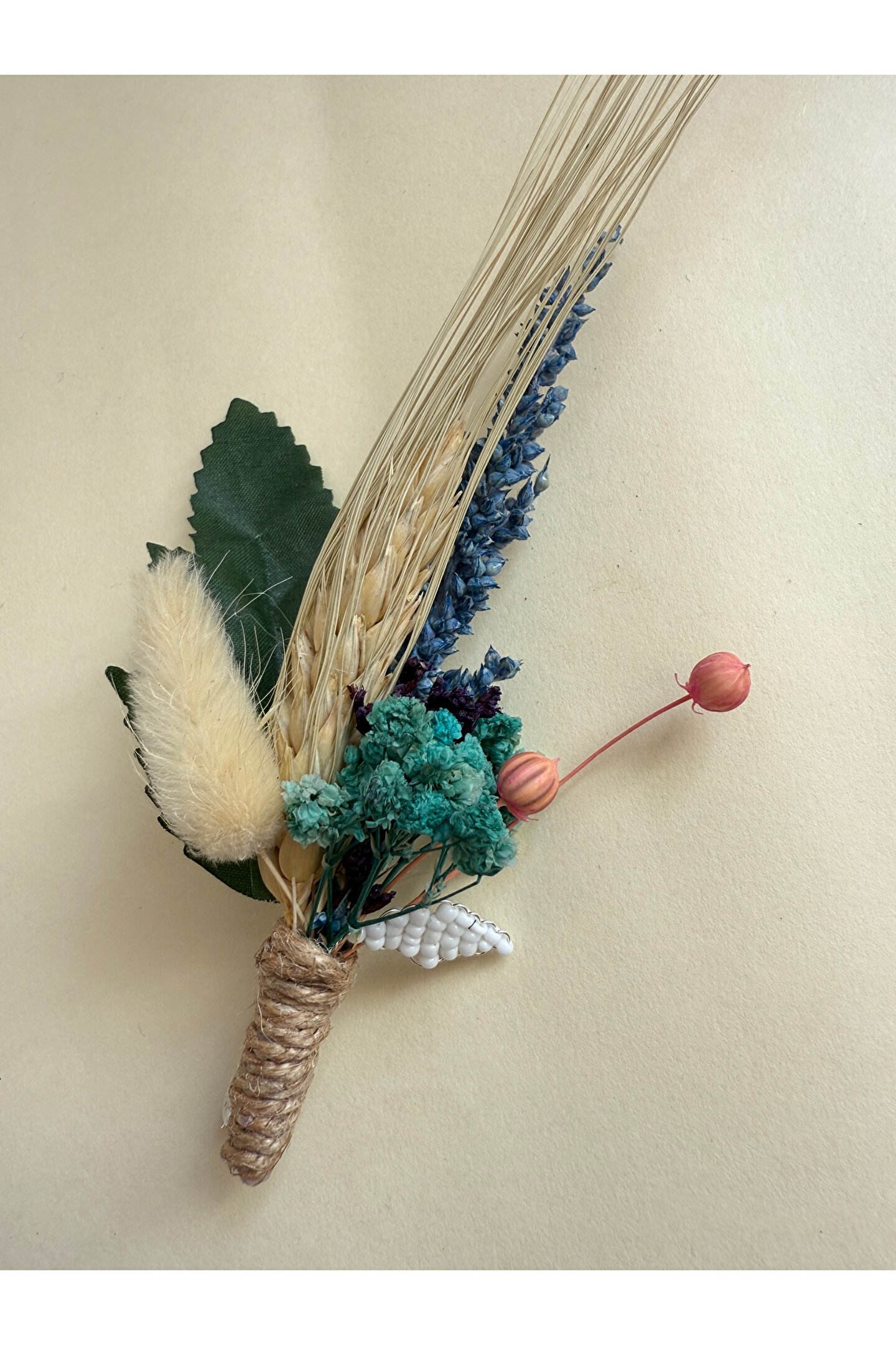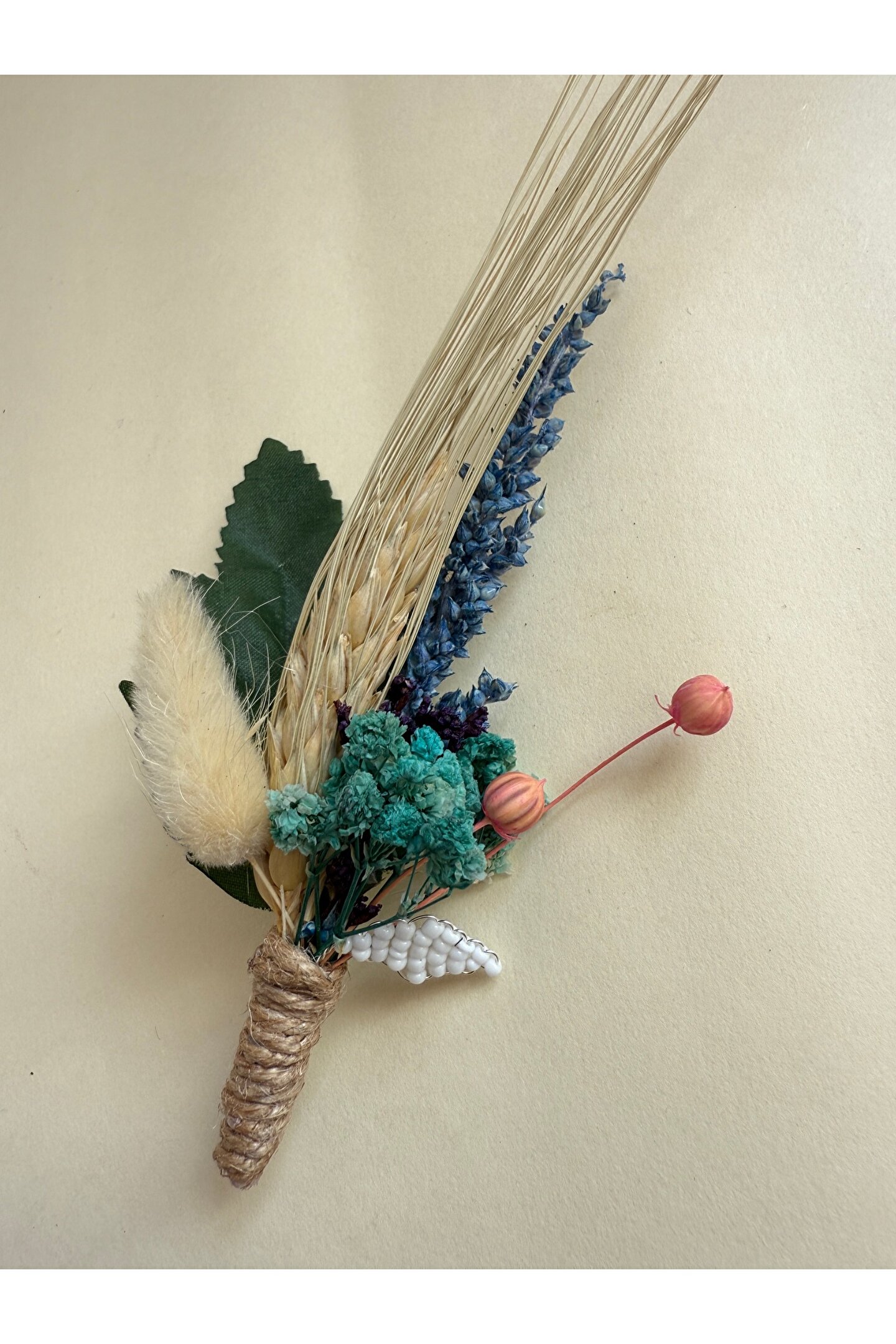 İthal kuru çiçekler ve yapay çiçekler ile hazırlanan özel tasarım damat yaka çiçeği
