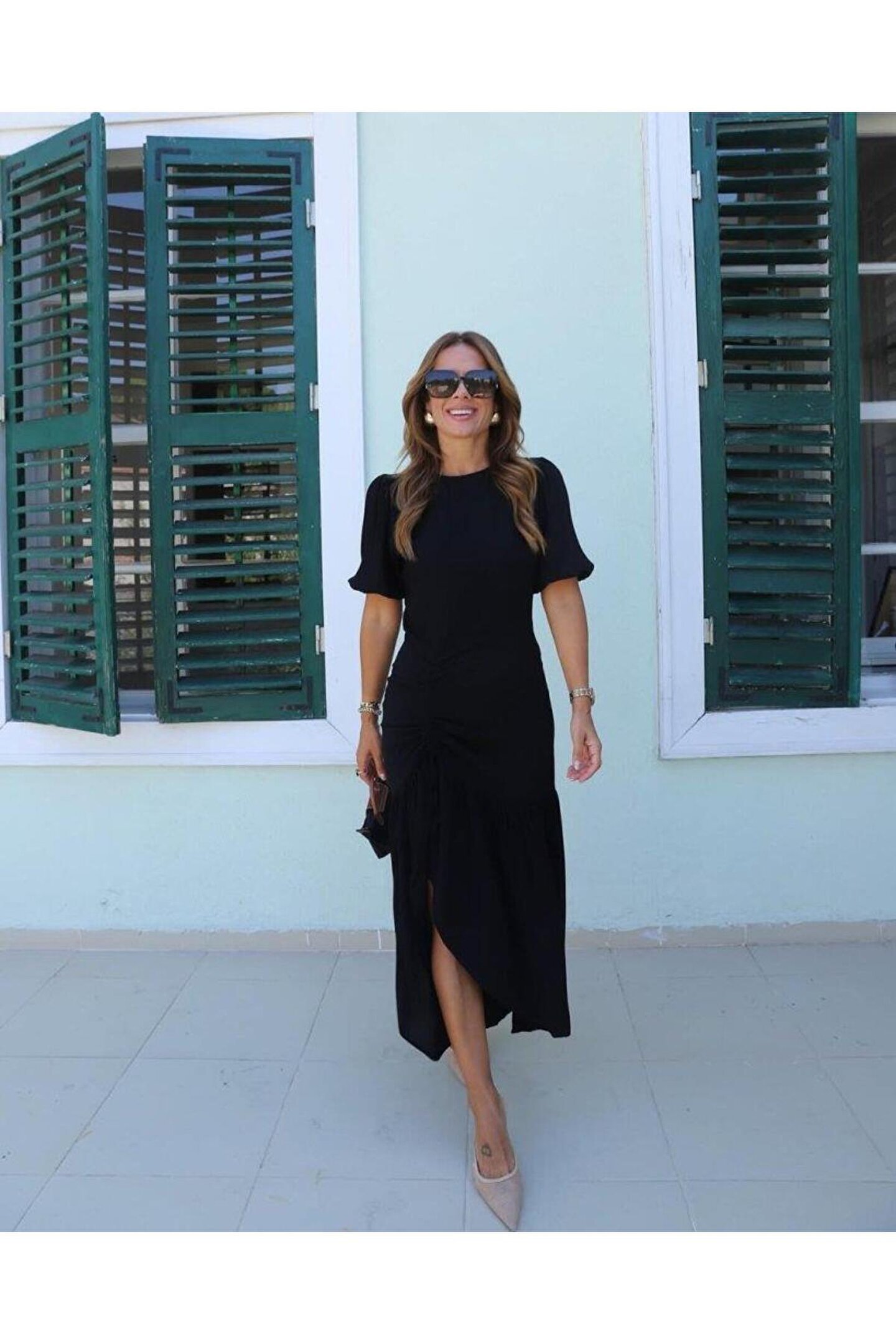Bizcomoda Kadın Kısa Kollu Bisiklet Yakalı Yandan Yırtmaçlı Büzgülü Janjan Krep Elbise
