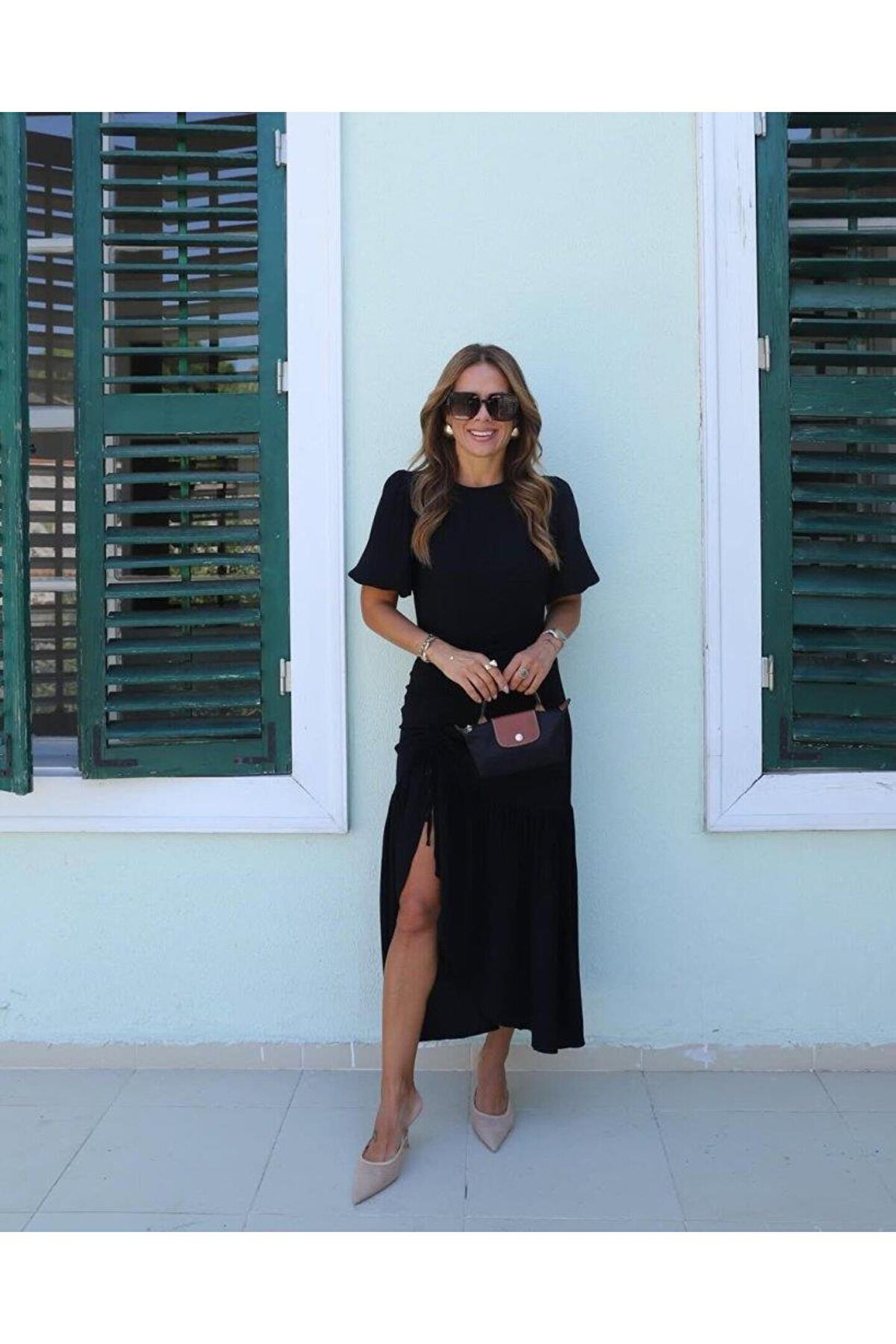 Kadın Kısa Kollu Bisiklet Yakalı Yandan Yırtmaçlı Büzgülü Janjan Krep Elbise