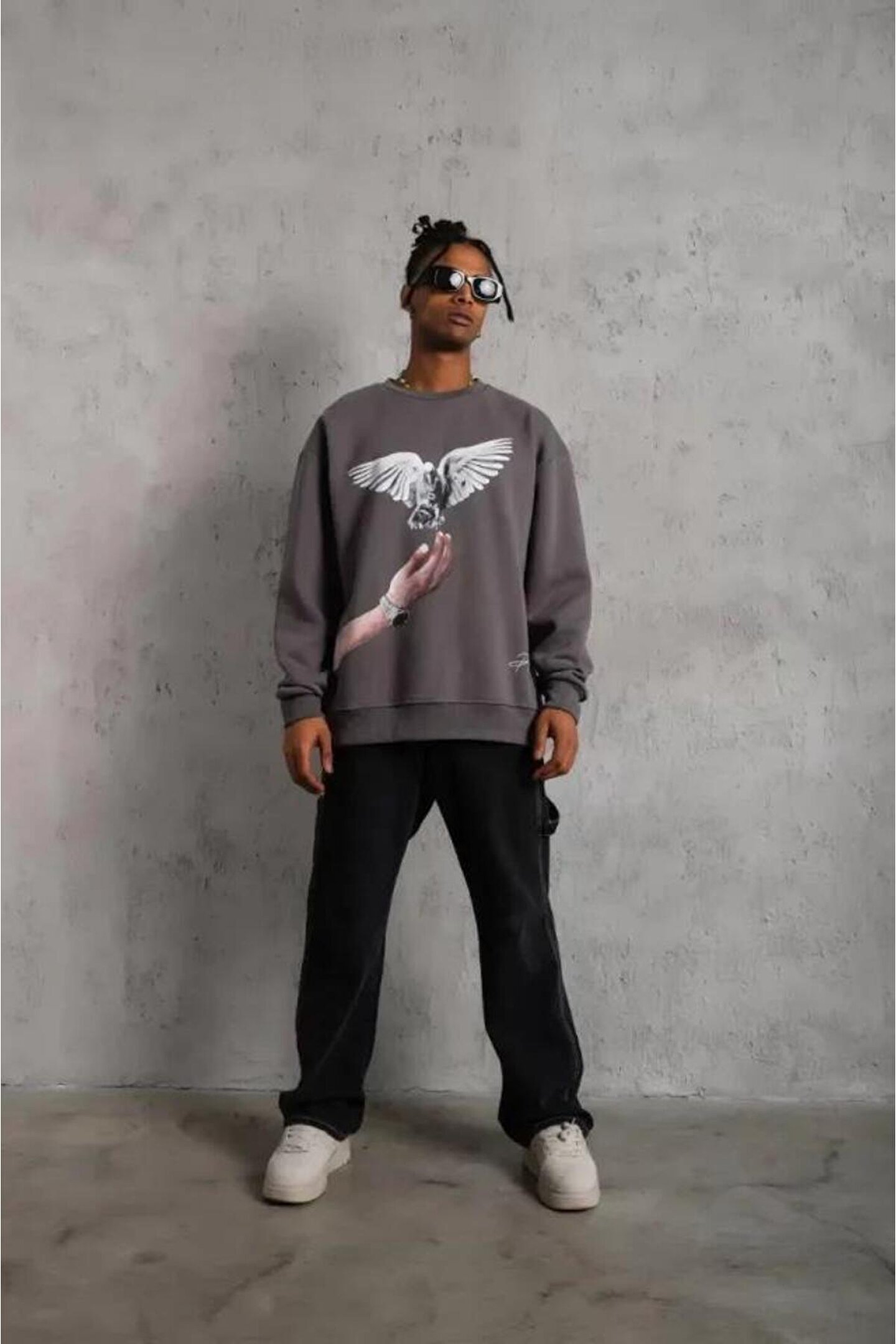 BLACK MODBLACK Erkek Güvercin Baskılı Sweatshirt - Gri