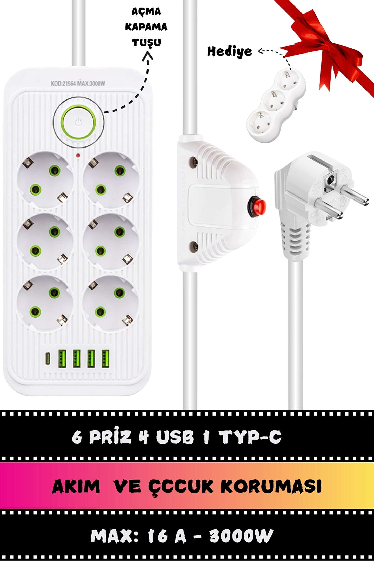 bossandmuse 1. Metre Uzatma Kablolu 6lı Akım Korumalı Priz 4 Usb + 1 Typ-c - 3lü Duvar Tipi Priz Hediye