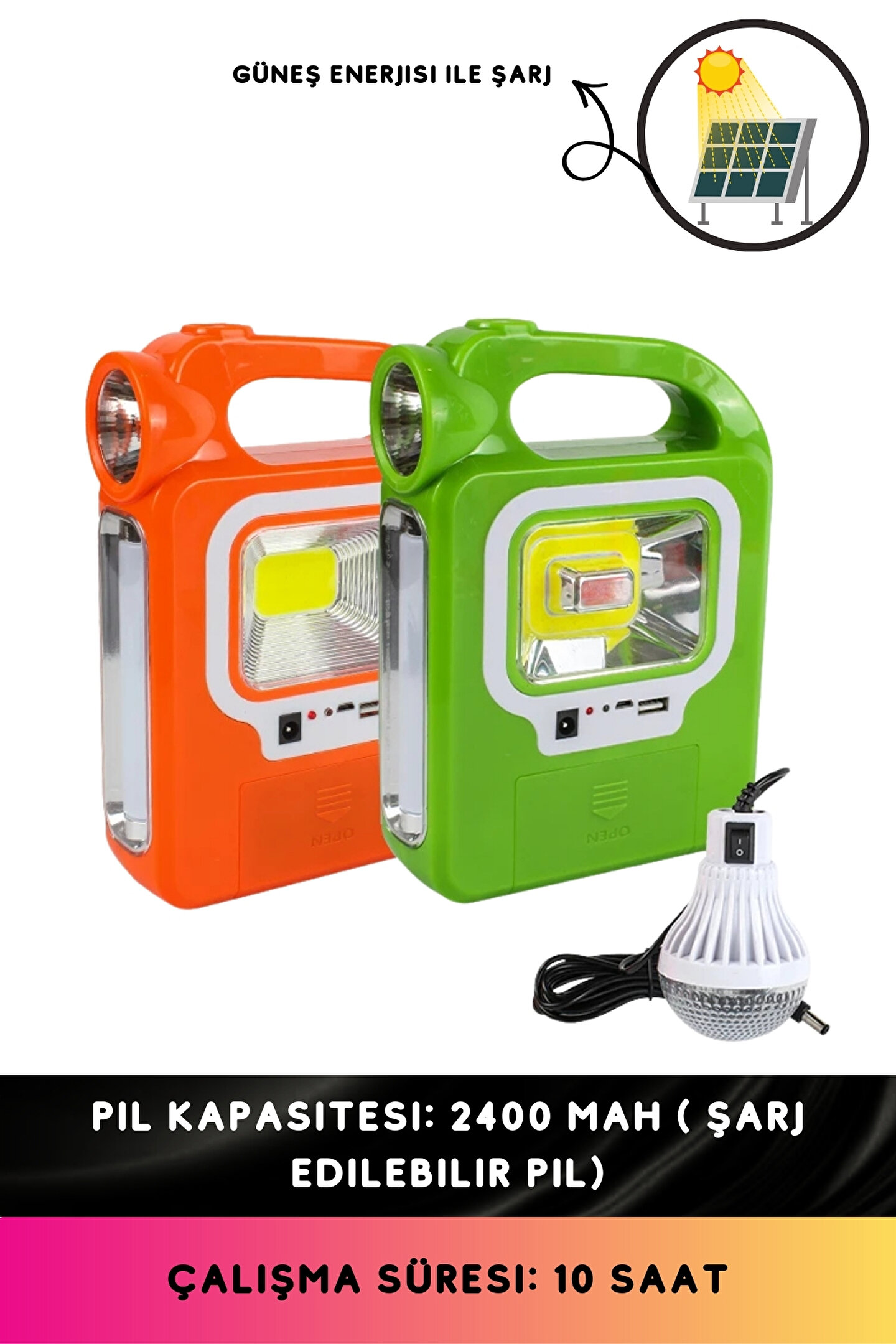 bossandmuse Solar Enerjili 3 Farklı Işıklı Ampul Bağlanan El Feneri Şarjlı Pil Hediye 10 Saat Işık 2400 Mah