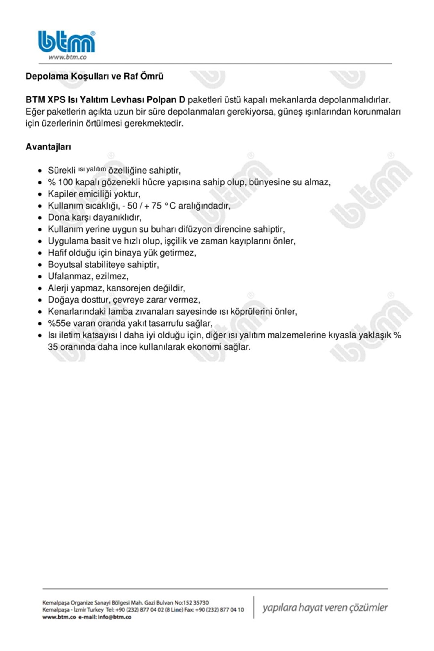BTM XPS Isı Yalıtım Levhası Polpan D paketleri üstü kapalı mekanlarda depolanmalıdırlar. Eğer paketlerin açıkta uzun bir süre depolanmaları gerekiyorsa, güneş ışınlarından korunmaları için üzerlerinin örtülmesi gerekmektedir.