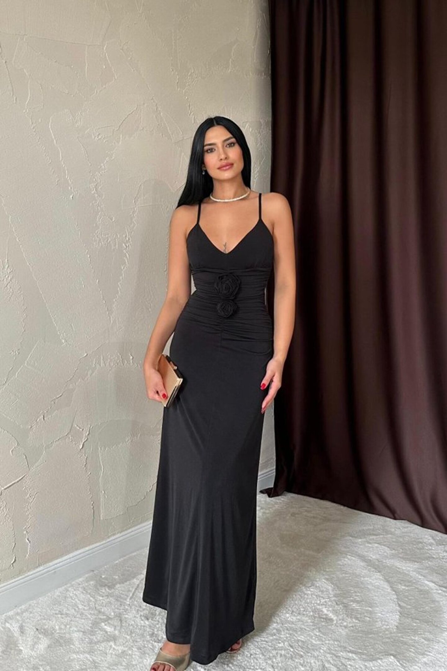 bubeny munn collection Siyah Büzgülü Uzun Güllü Elbise