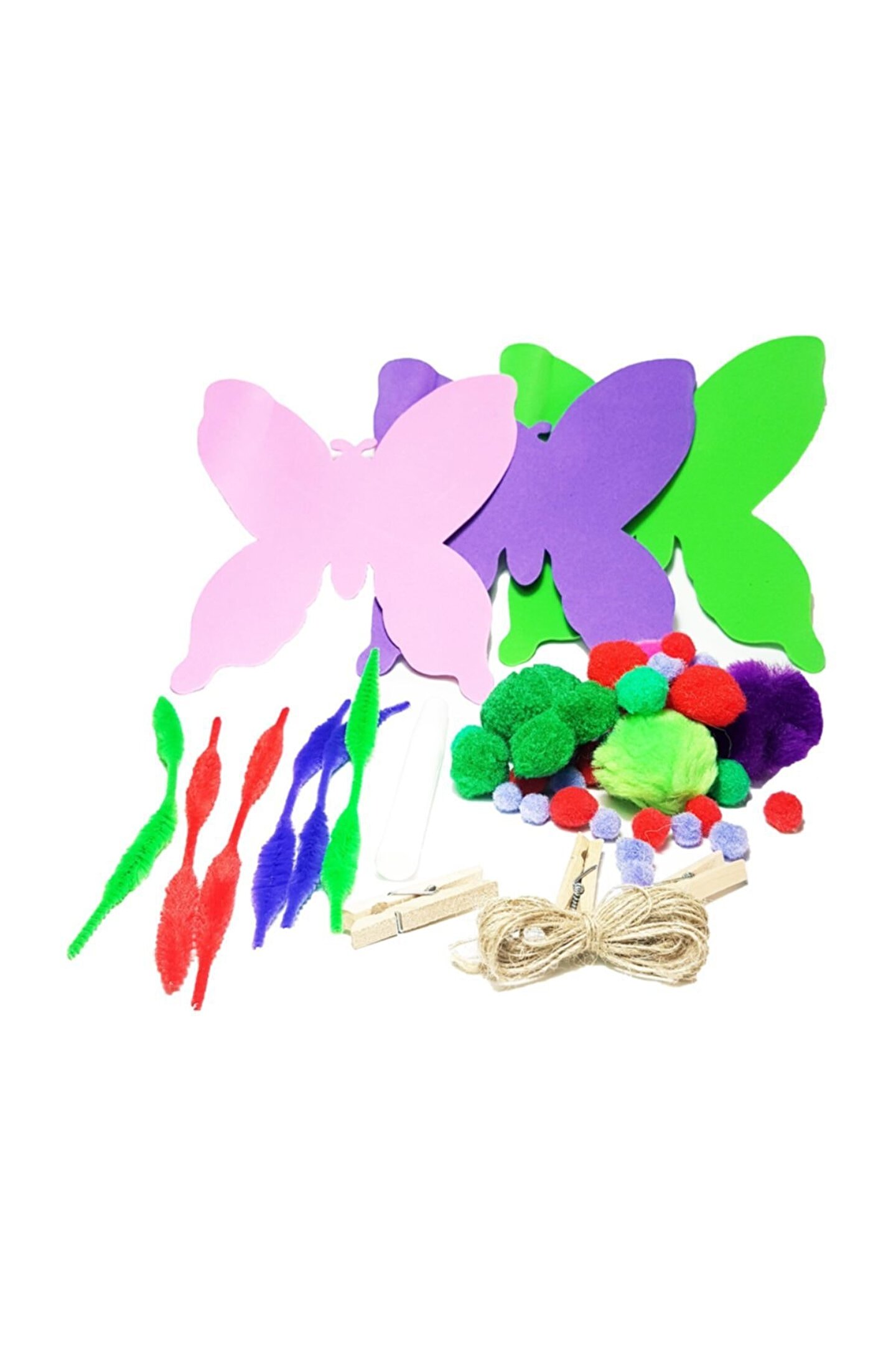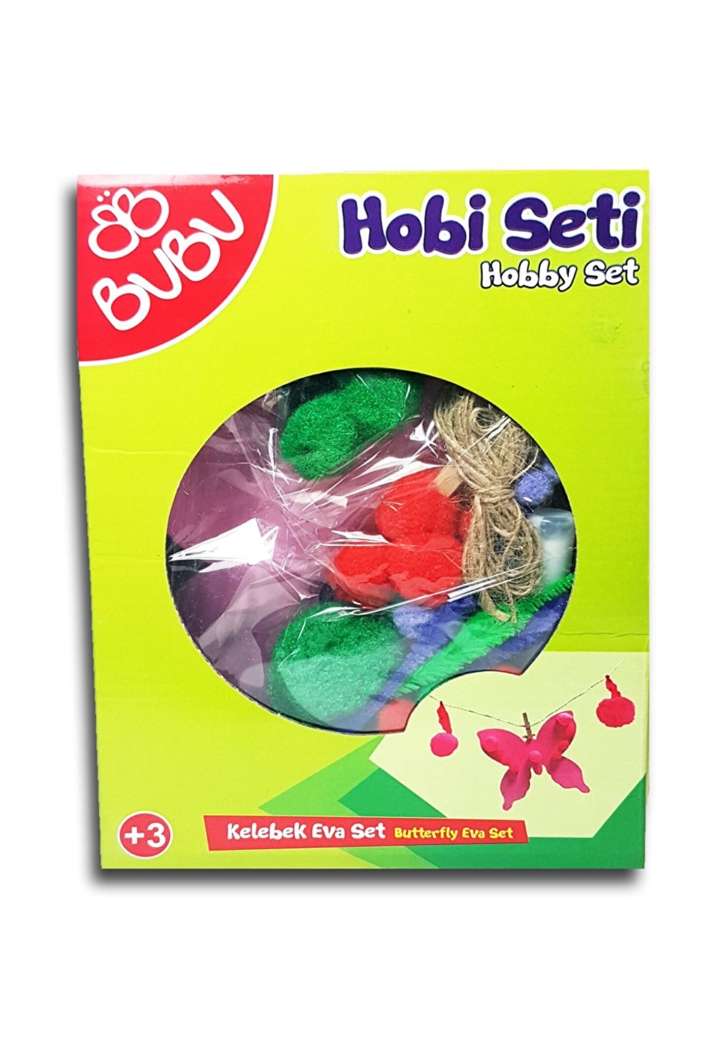 Bu; Bu Kelebekli Eva Seti HS0010 Bu; Bu Kelebekli Eva Seti HS0010 ? Çocuklarınızla birlikte uygulama yapabileceğiniz, yaparken eğleneceğiniz renk renk Eva Kelebekler ve karışık hobi seti :) ? Ürün kesinlikle kanserojen madde içermez; Çocuklar İçin Uygundur; ? Ürün Avrupa oyuncak standartına (EN71) uygun üretilmiştir; ? Paket içerisindekiler ? 3 Adet Renkli Kelebek Eva ? 35 Adet Karışık Ponpon ? 6 Adet Şönil ? 3 Adet Ahşap Mandal ? 1 Kraft İp;