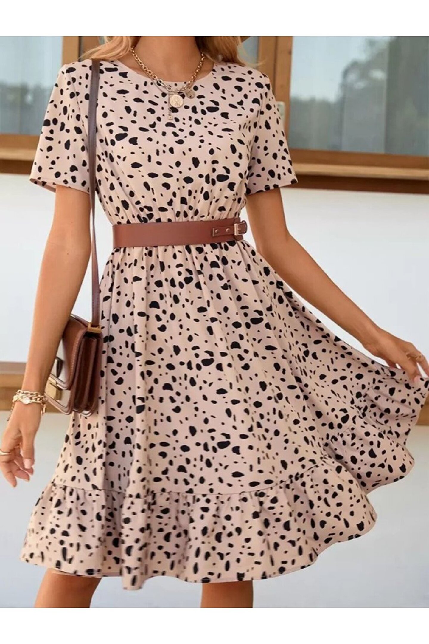 BÜŞRA TEZEL MODA EQURİ Kadın Kısa Kollu Bisiklet Yaka Desenli Süprem Elbise