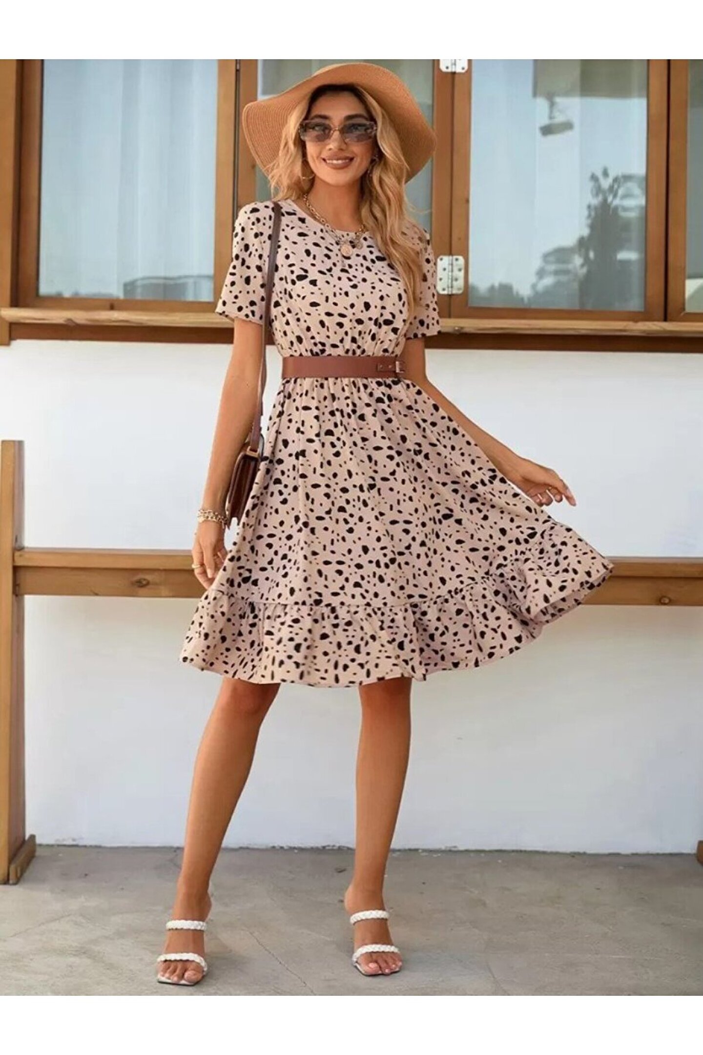 BÜŞRA TEZEL MODA EQURİ Kadın Kısa Kollu Bisiklet Yaka Desenli Süprem Elbise