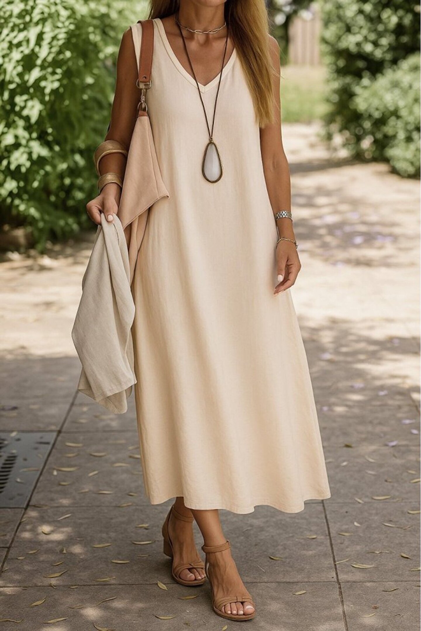 BÜŞRA TEZEL MODA EQURİ Kadın Kolsuz V Yakalı Maksi Boy Ithal Keten Elbise