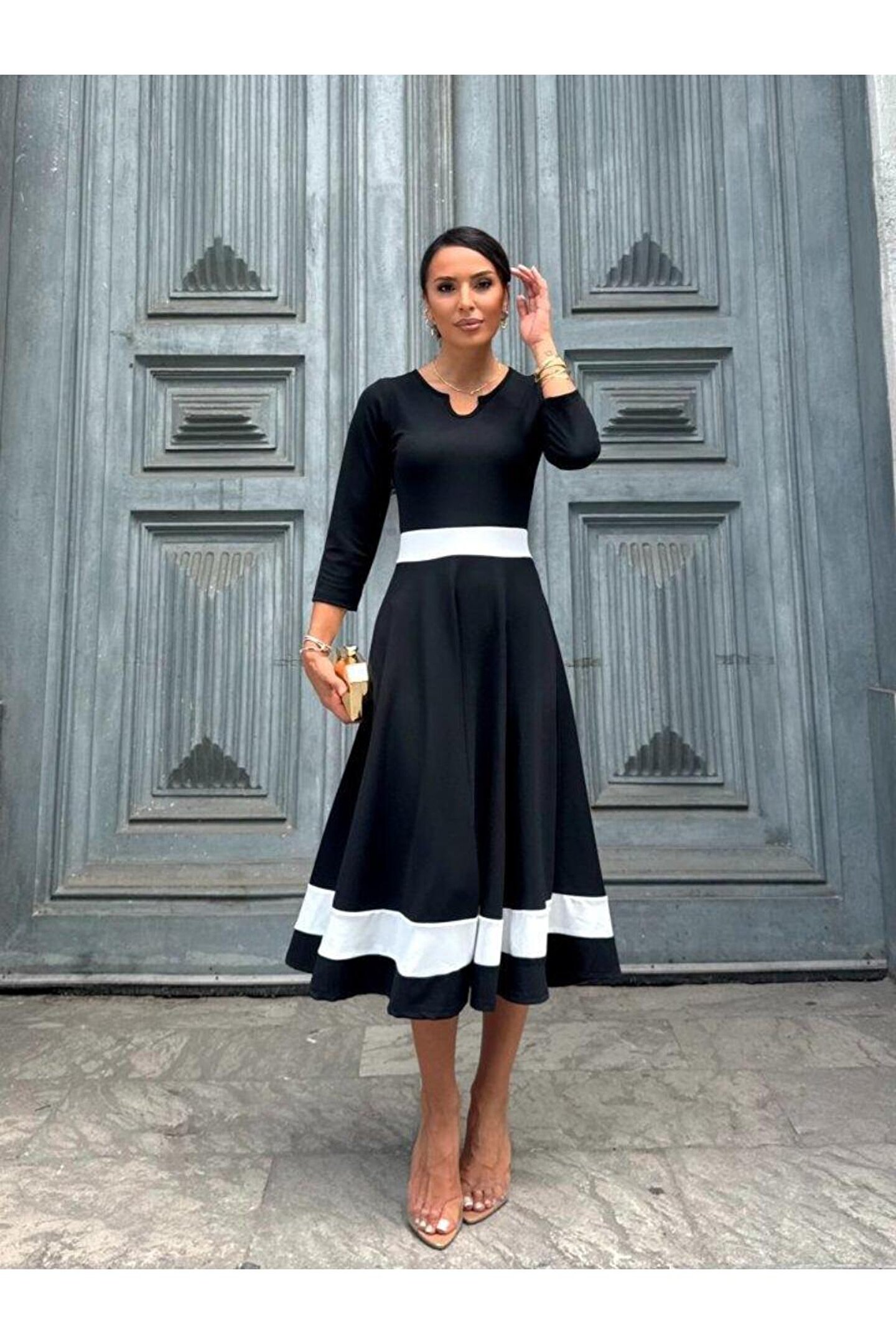 Kadın Truvakarkol Yakası Açık Blok Renkli Krep Midi Elbise