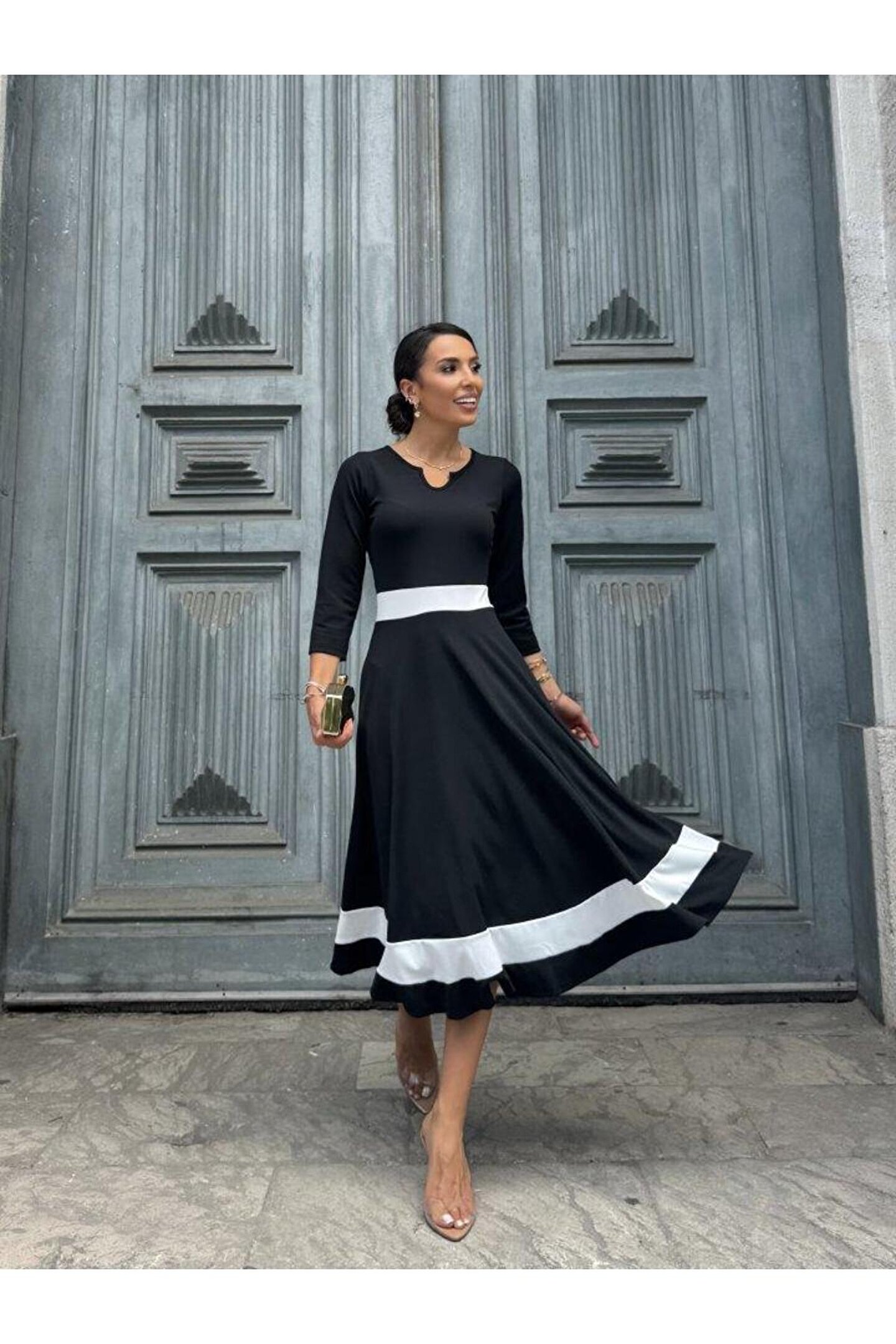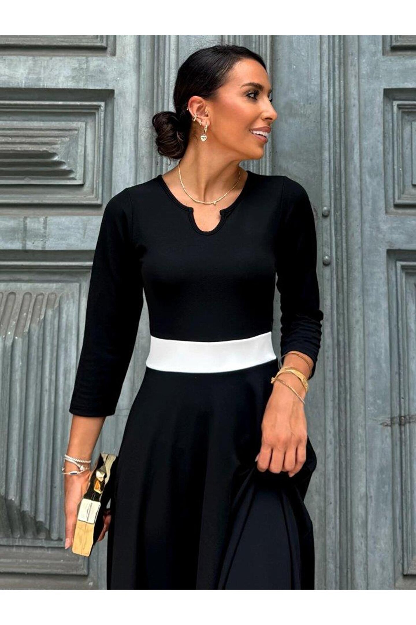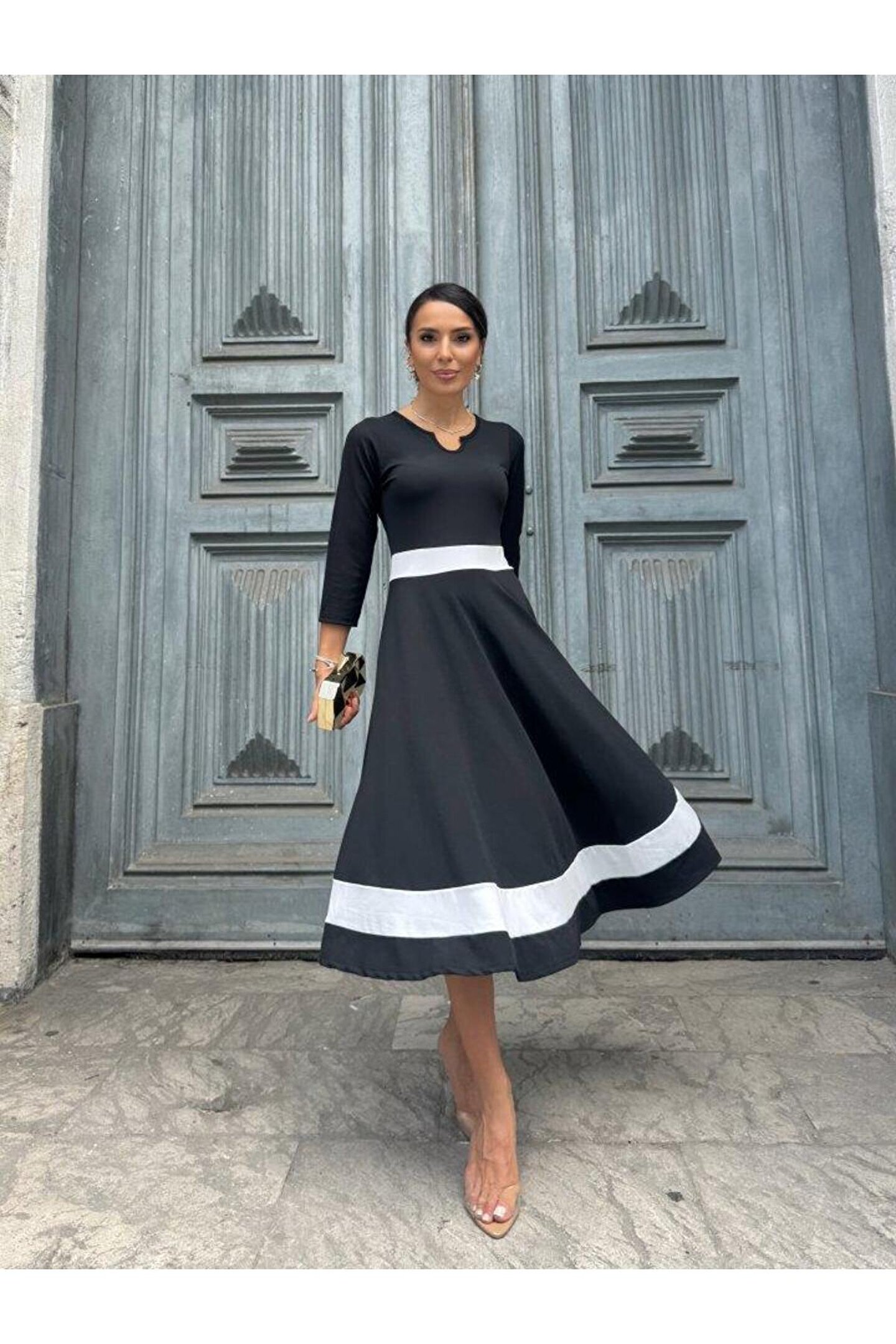 BÜŞRA TEZEL MODA Kadın Truvakarkol Yakası Açık Blok Renkli Krep Midi Elbise