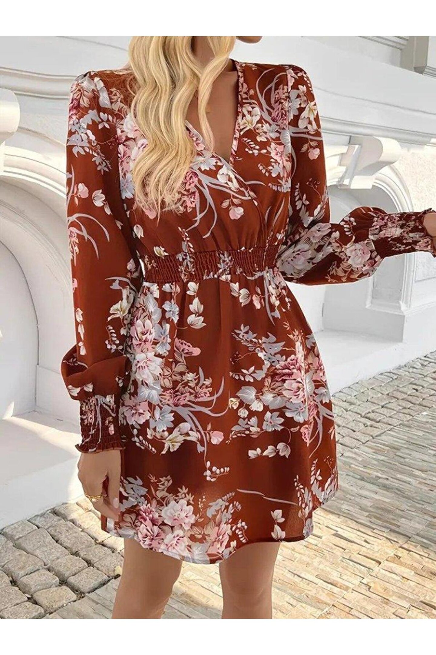 Kadın Uzun Kollu Kruvaze Yakalı çiçek Desenli Mini Süprem Elbise.; Ürün detayları ve kullanım hissi kişisel tercihlere göre değişiklik gösterebilir.