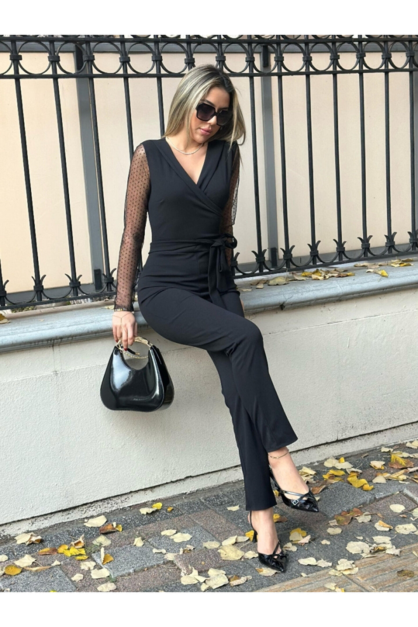 Butik Aura Mou EQURİ Kadın Uzun Kollu Kruvaze Yakalı Kolları Tül Detay Beli Kuşaklı Ithal Krep Tulum