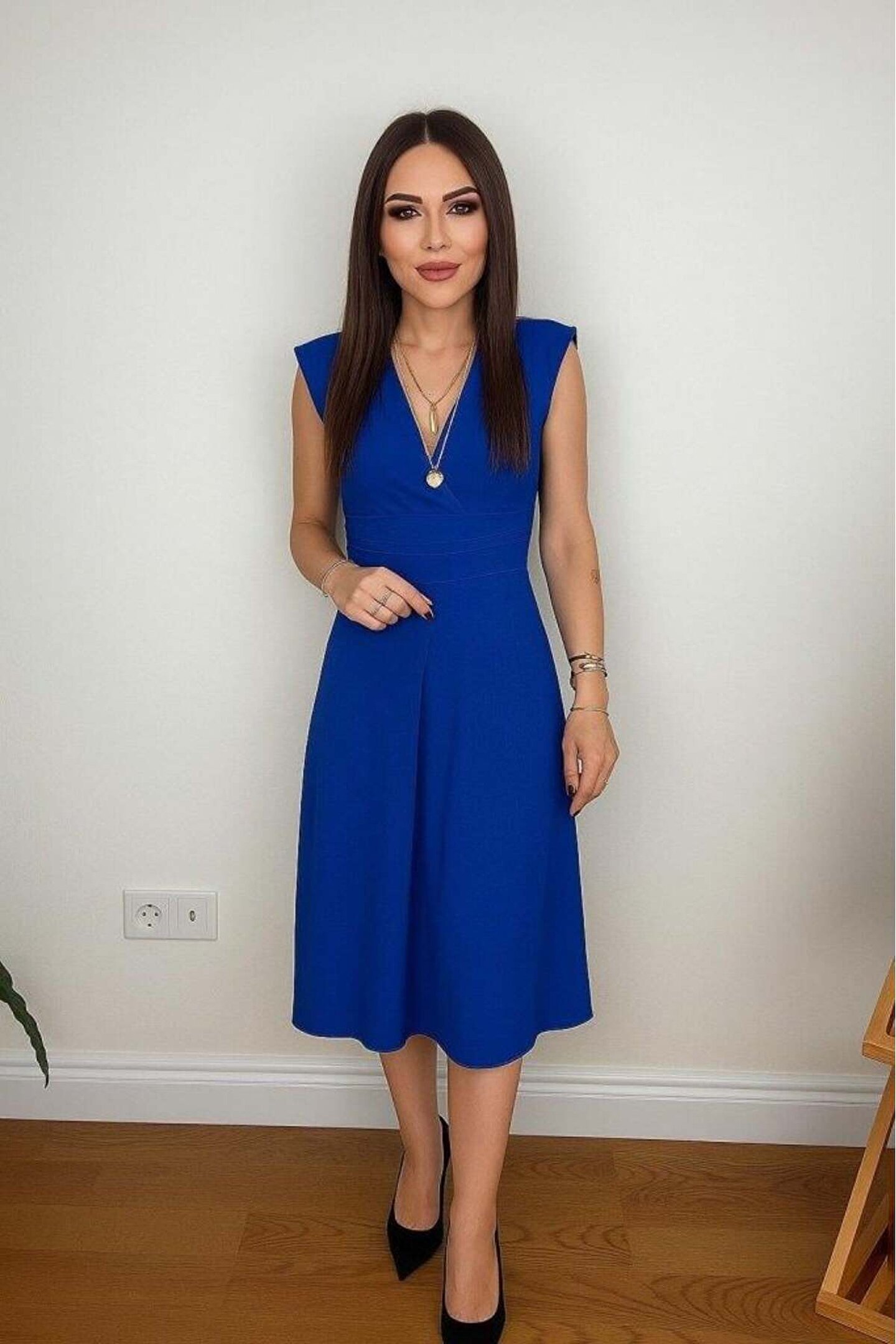 Butik Aura Mou Kadın Kısa Kollu Kruvaze Yakalı Bel Korsajı Buzgulu Midi Janjan Krep Elbise