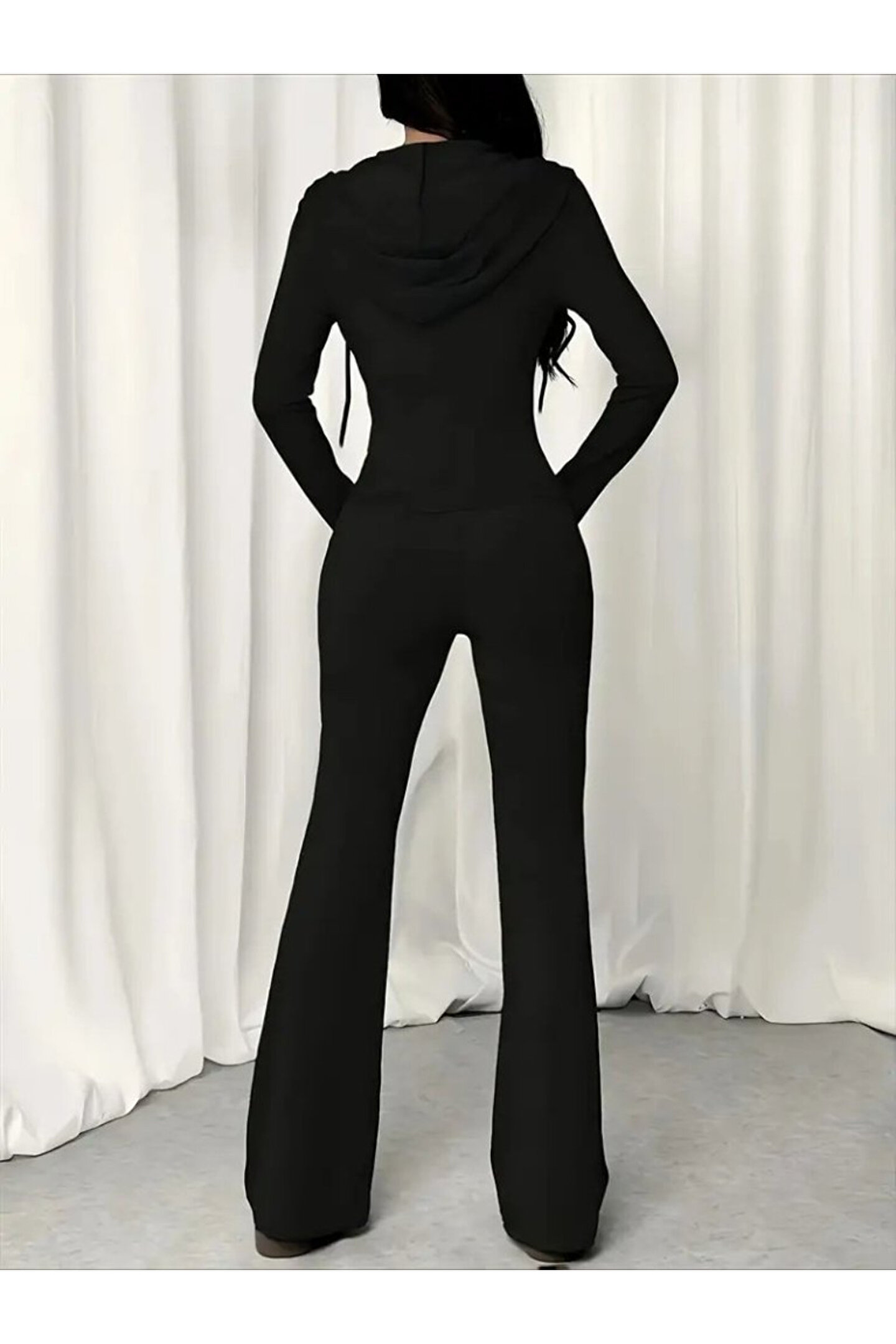 Kadın Uzun Kollu Kapşonlu Bağcıklı önü Fermuarlı Viskon Iki Iplik Bluz Ve Pantolon Ikili Takım