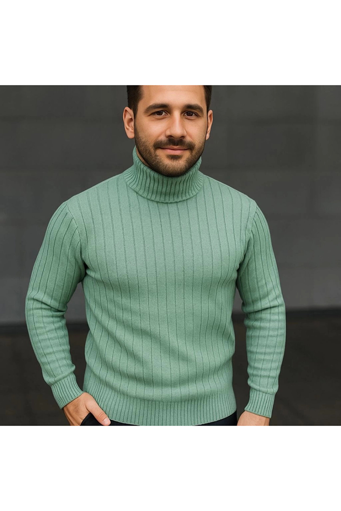 Erkek Balıkcı Yaka Bağazlı Triko Kazak Pamuklu Kalın Fitilli Dokuma, Regular Fit Uzun Kollu Kışlık Model - Mint Yeşili