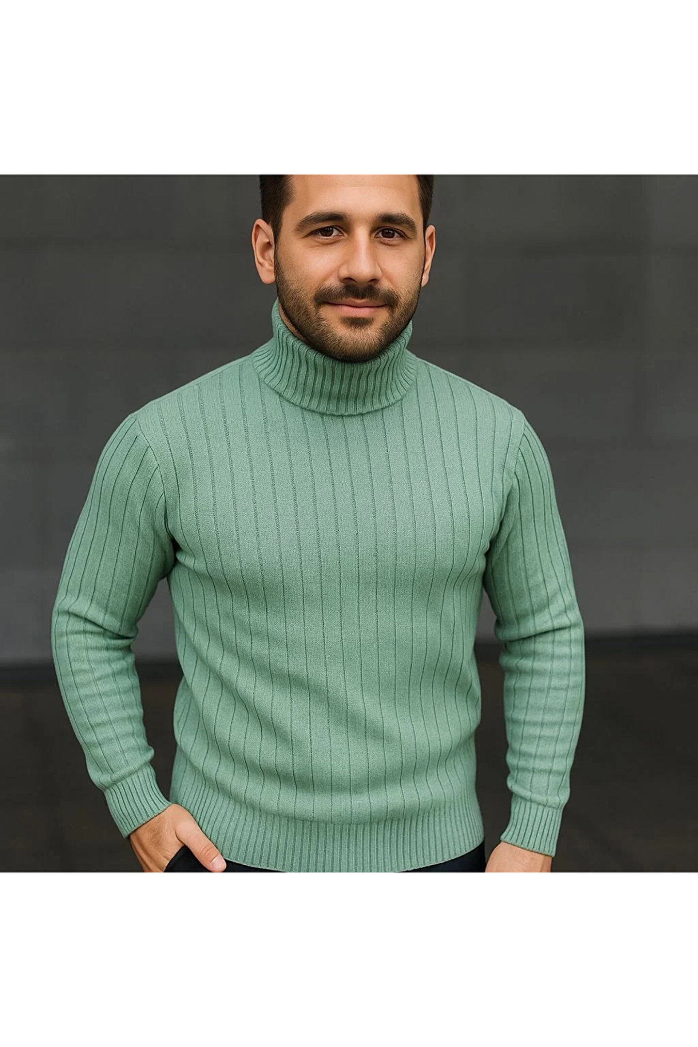 Erkek Balıkcı Yaka Bağazlı Triko Kazak Pamuklu Kalın Fitilli Dokuma, Regular Fit Uzun Kollu Kışlık Model - Mint Yeşili