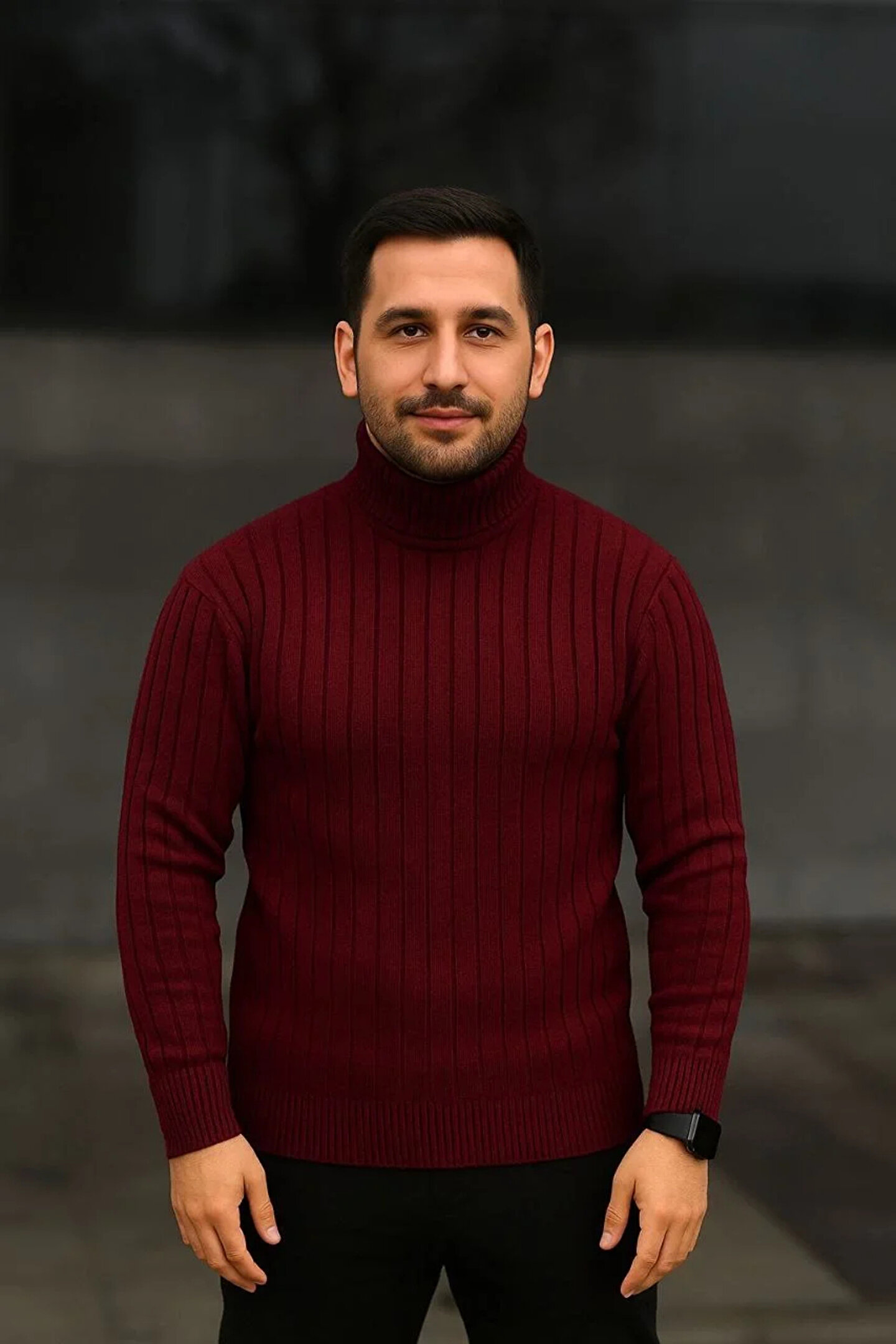 Erkek Balıkcı Yaka Bağazlı Triko Kazak Pamuklu Kalın Fitilli Dokuma, Regular Fit Uzun Kollu Kışlık Model - Bordo