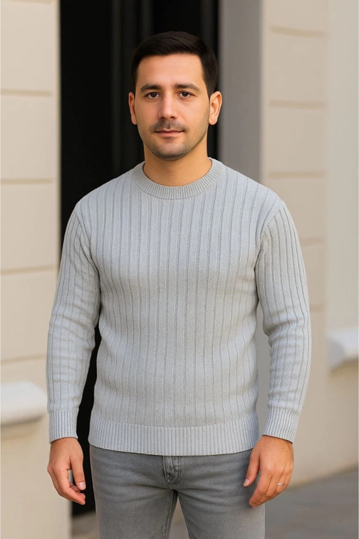 Erkek Bisiklet Yuvarlak Yaka Triko Kazak Pamuklu Kalın Fitilli Dokuma, Regular Fit Uzun Kollu Kışlık Model - Gri