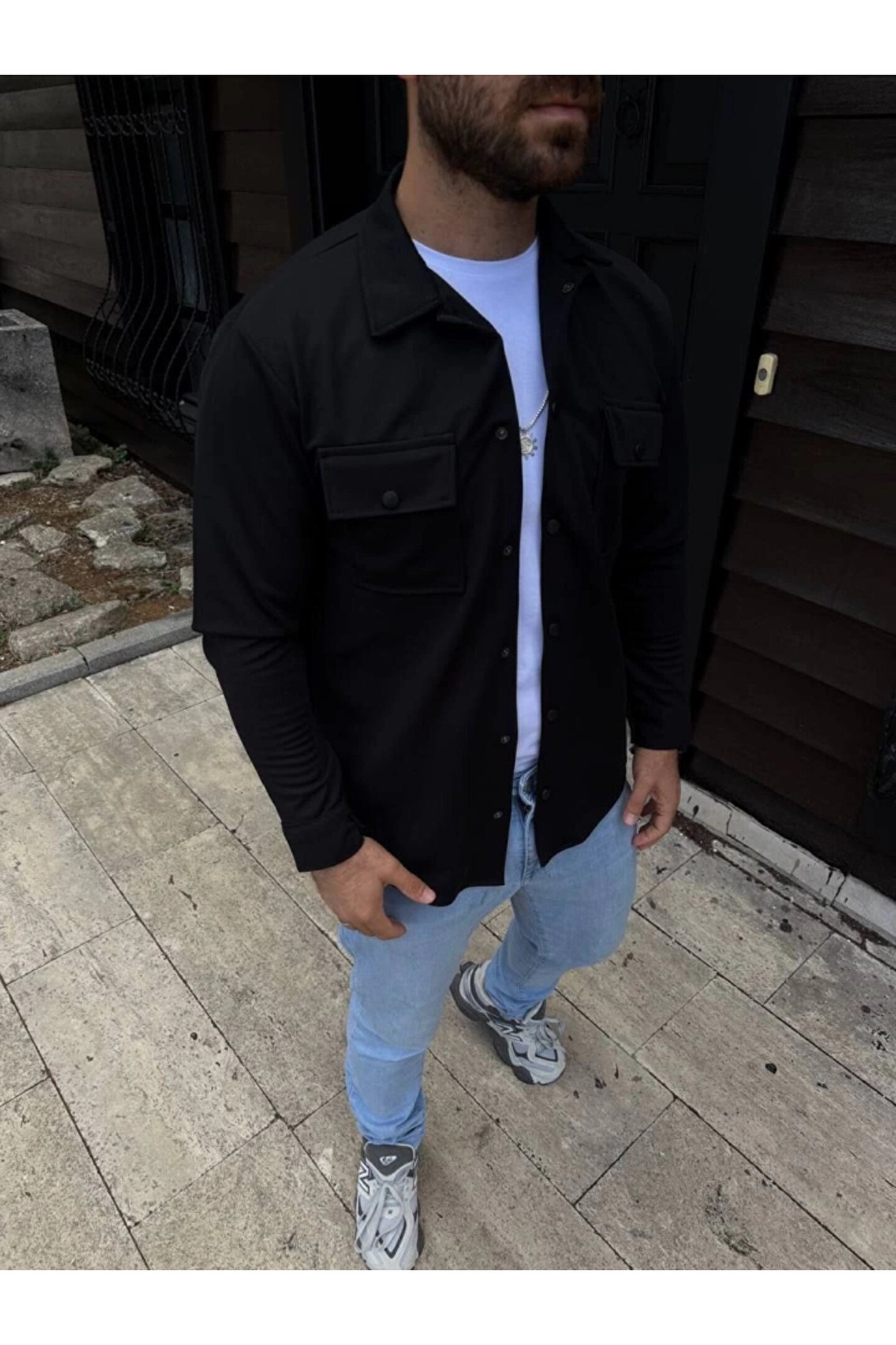 Erkek Diagonal Kumaş Cepli Çıtçıtlı Uzun Kollu, Gömlek Oversize Rahat Kalıp Günlük Şık Stil - Siyah