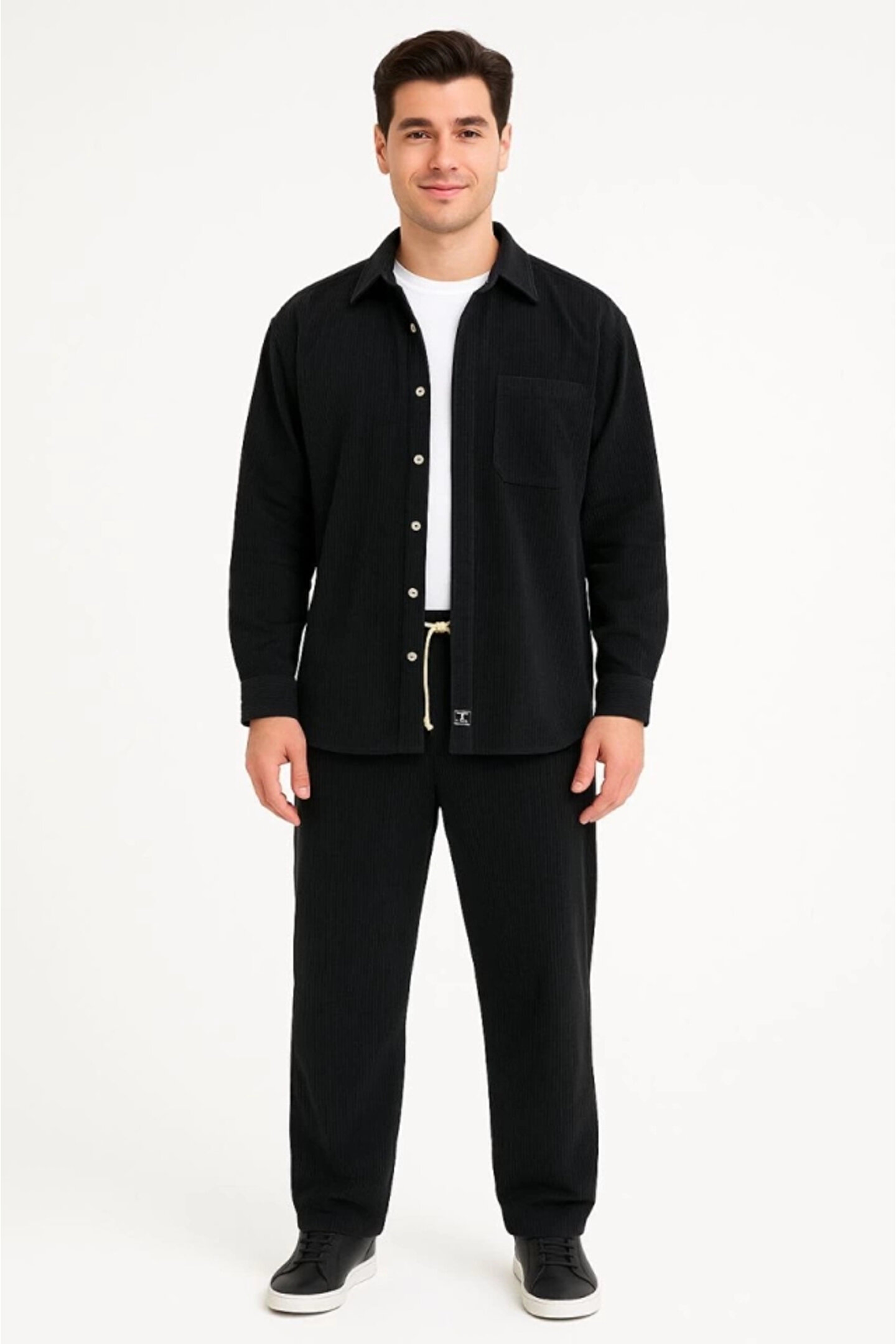 Erkek Kadife Oversize Takım – Gömlek Ve Pantolon İkili Set Füme Corduroy Şıklığı, Rahat Ve Zarif Duruş Yumuşak Dokulu Kadife Kumaş, Düğmeli Gömlek Üst Ve Lastikli Pantolon Alt Parça Ile Gün Boyu Konfor- Siyah