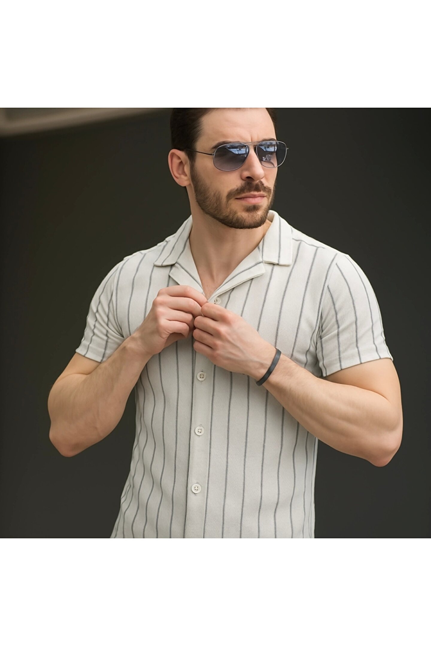 Butik Erkek Kısa Kollu Gri çizgi Desenli örme Kumaş Pamuklu Gömlek