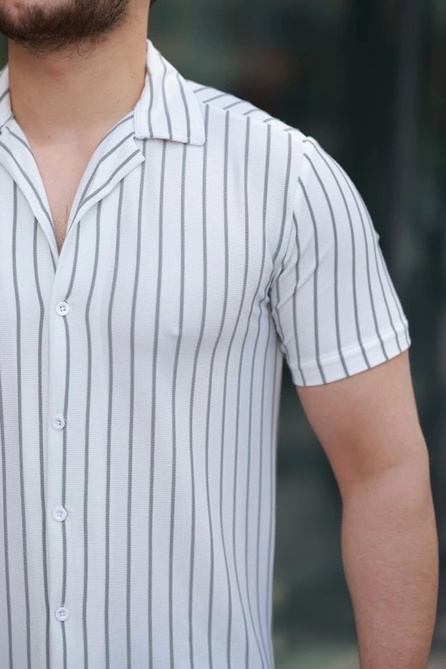 Butik Erkek Kısa Kollu Gri çizgi Desenli örme Kumaş Pamuklu Gömlek