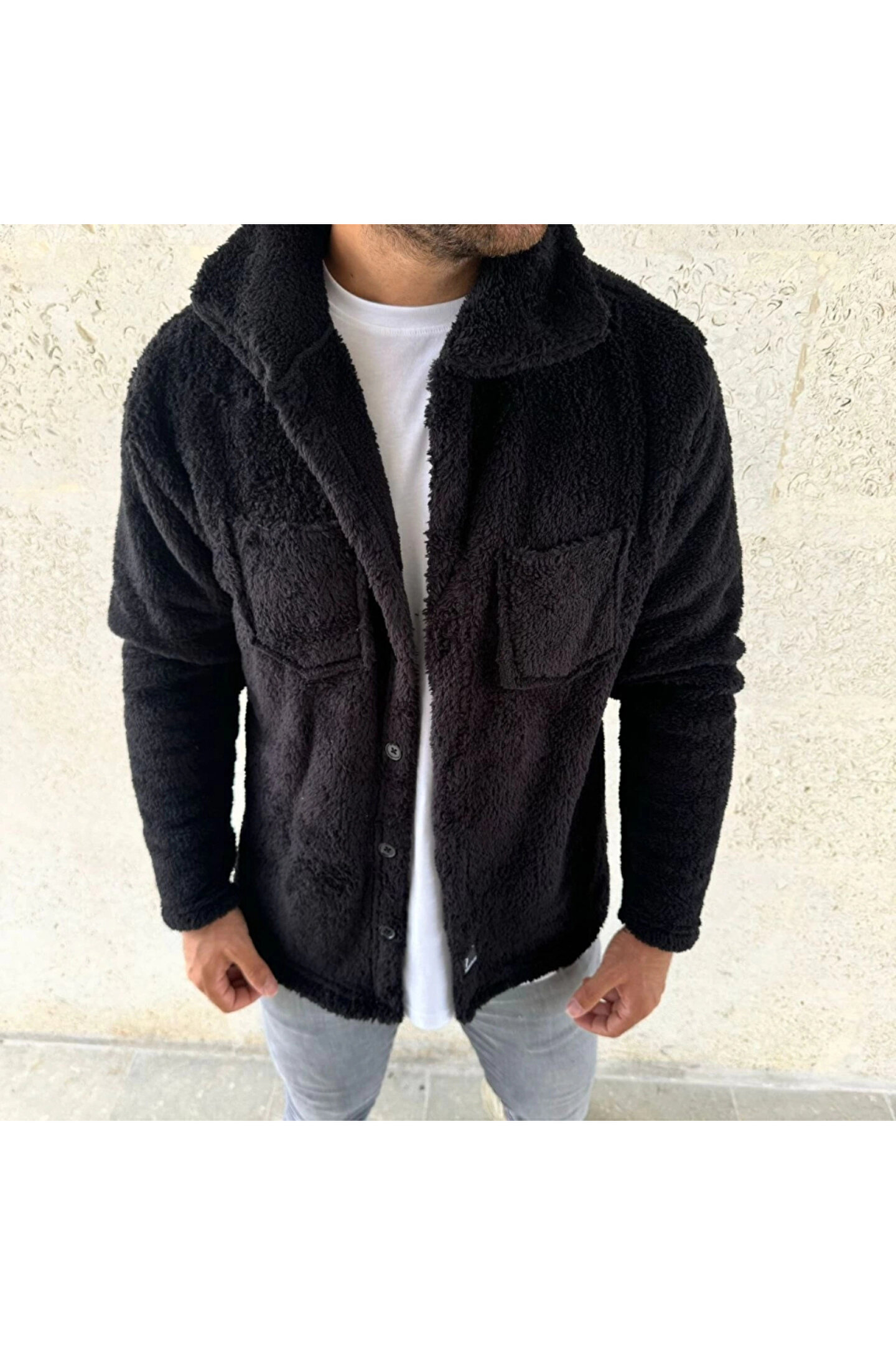 Erkek Pelüş Polar Hırka Gömlek – Yakalı, İlik Düğmeli, Göğüs Cepli, Yumuşak Dokulu Kışlık Regular Fit Rahat Günlük Model - Siyah