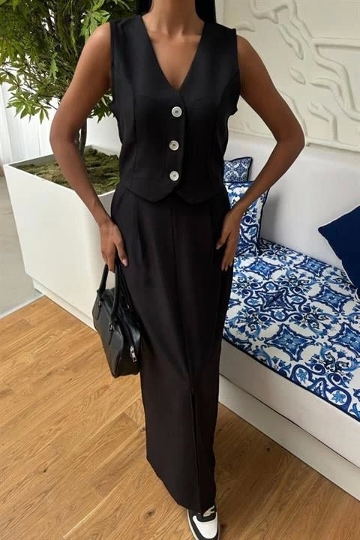 Butik Etek Yırtmaçlı Yelekli Keten Takım 10131
