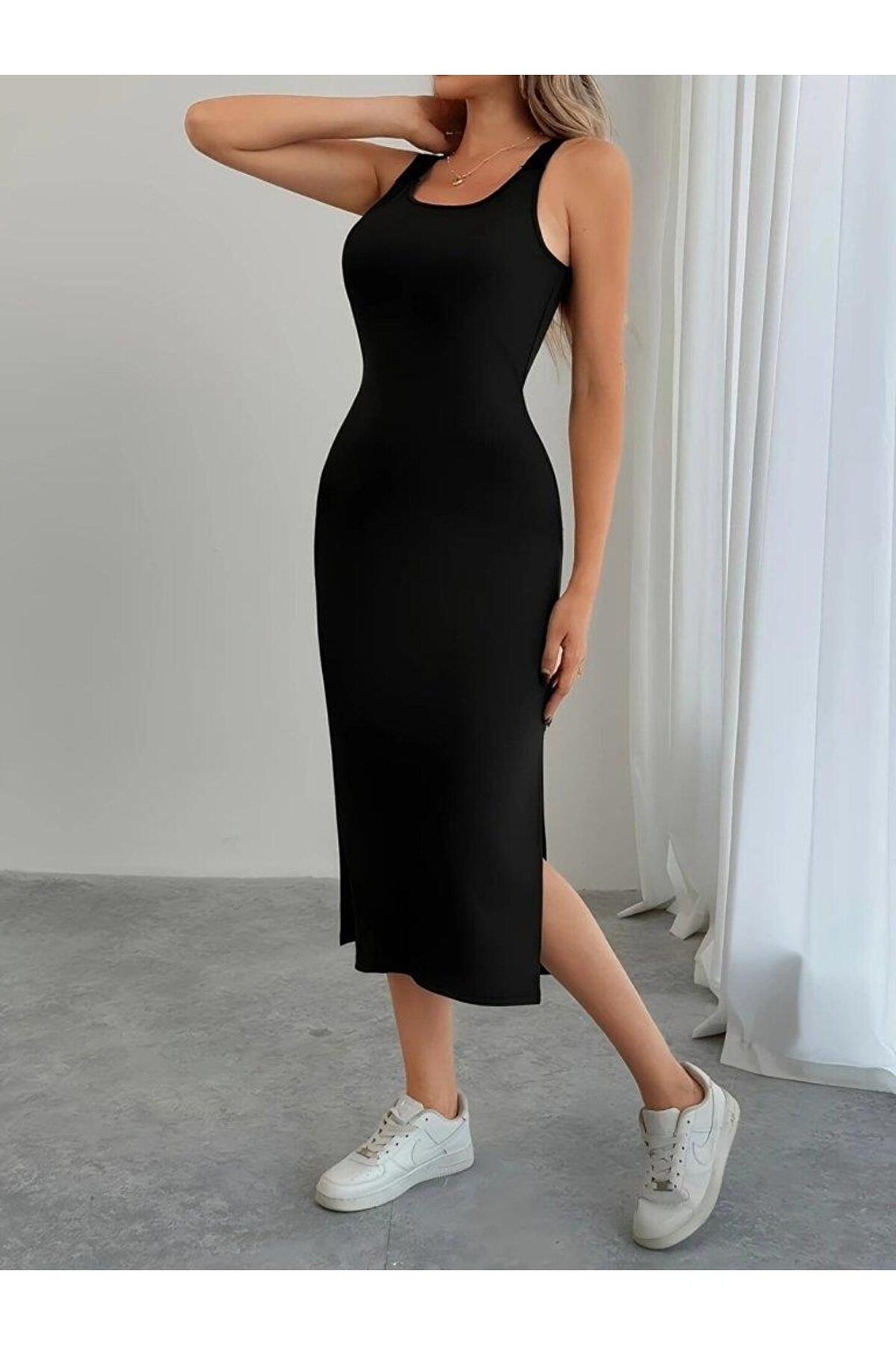 Butik Kadın Askılı Yuvarlak Yakalı Yandan Yırtmaçlı Arkası Dantel Detaylı Viskon Elbise