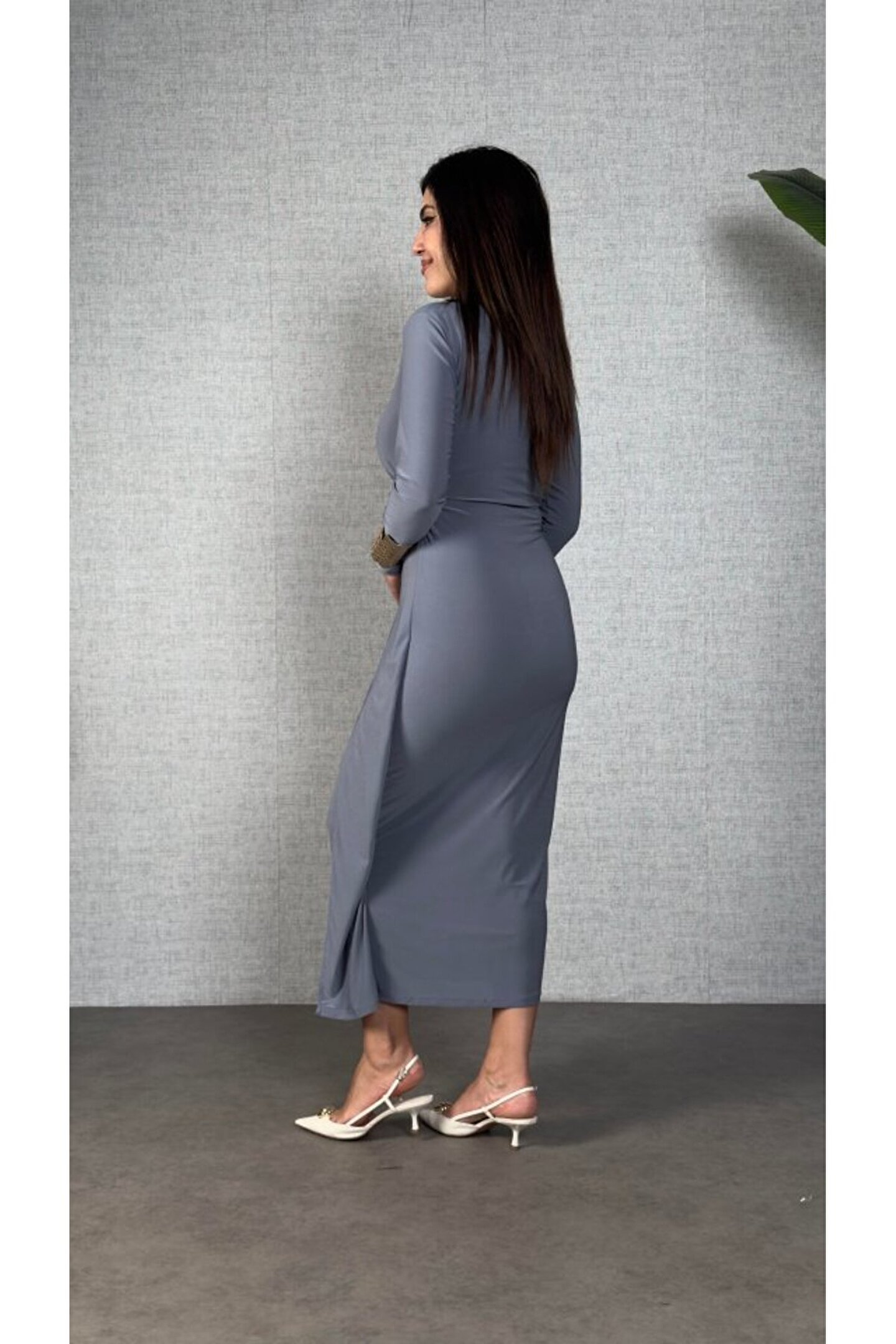 Kadın Balıkçı Yaka Toka Detay Sandy Kumaş Midi Boy Elbise