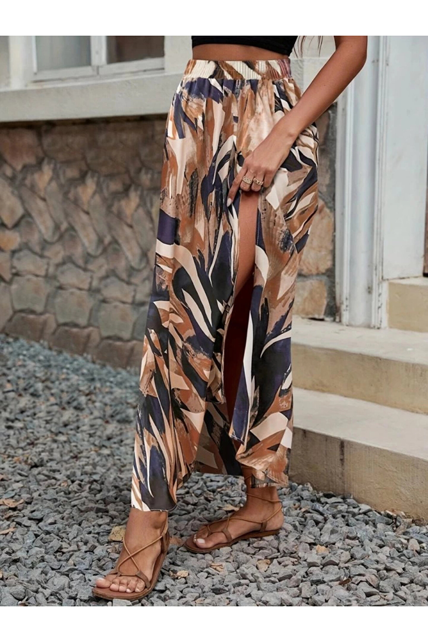 Kadın Beli Büzgülü Yandan Yırtmaçlı Desenli Süprem Etek