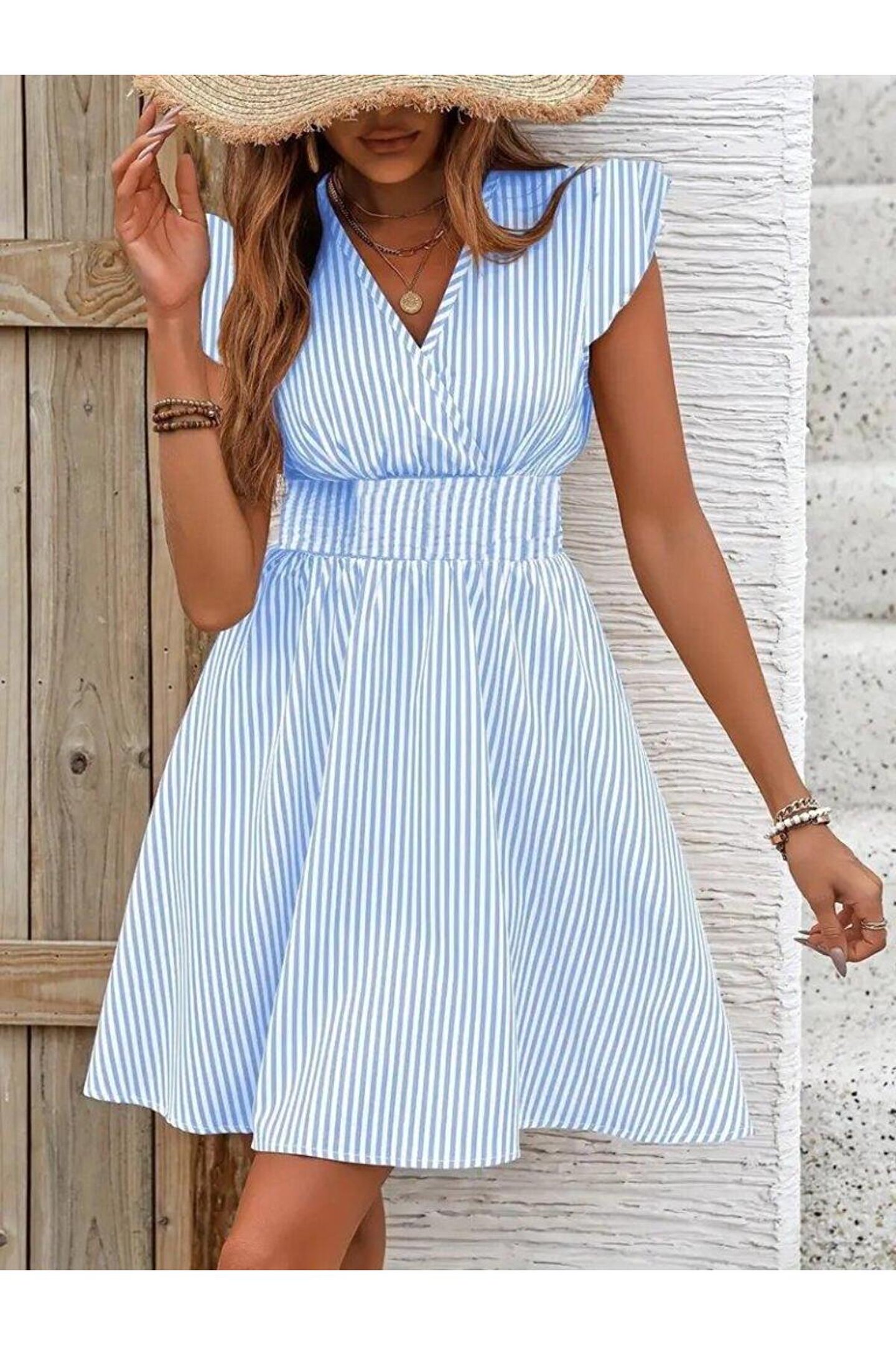 Pile Etek İnce Askılı Korse Formlu Poplin Kumaş Mavi Midi Elbise