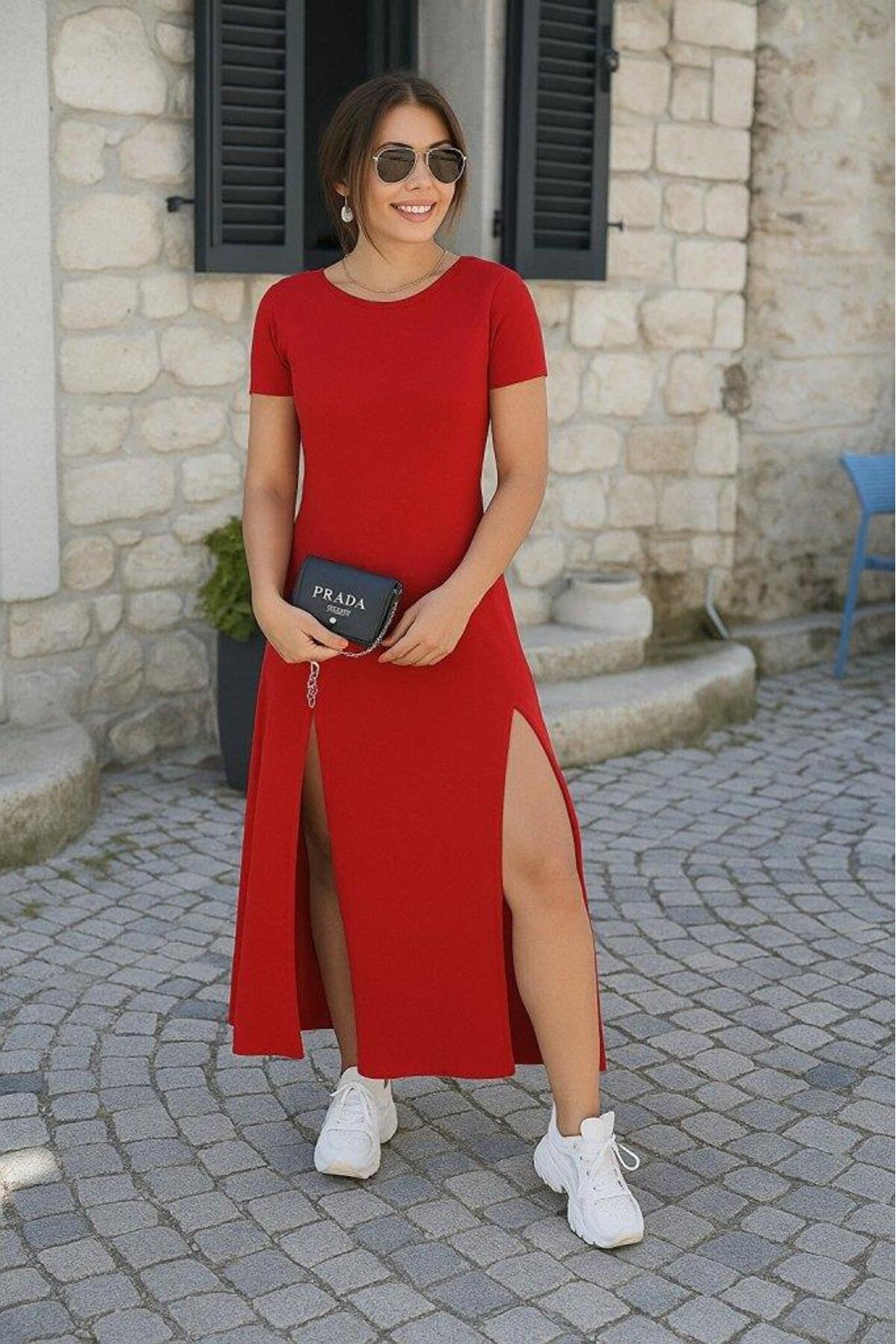 Kadın Kısa Kollu Sırt Dekolteli Yırtmaç Detaylı Viskon Elbise
