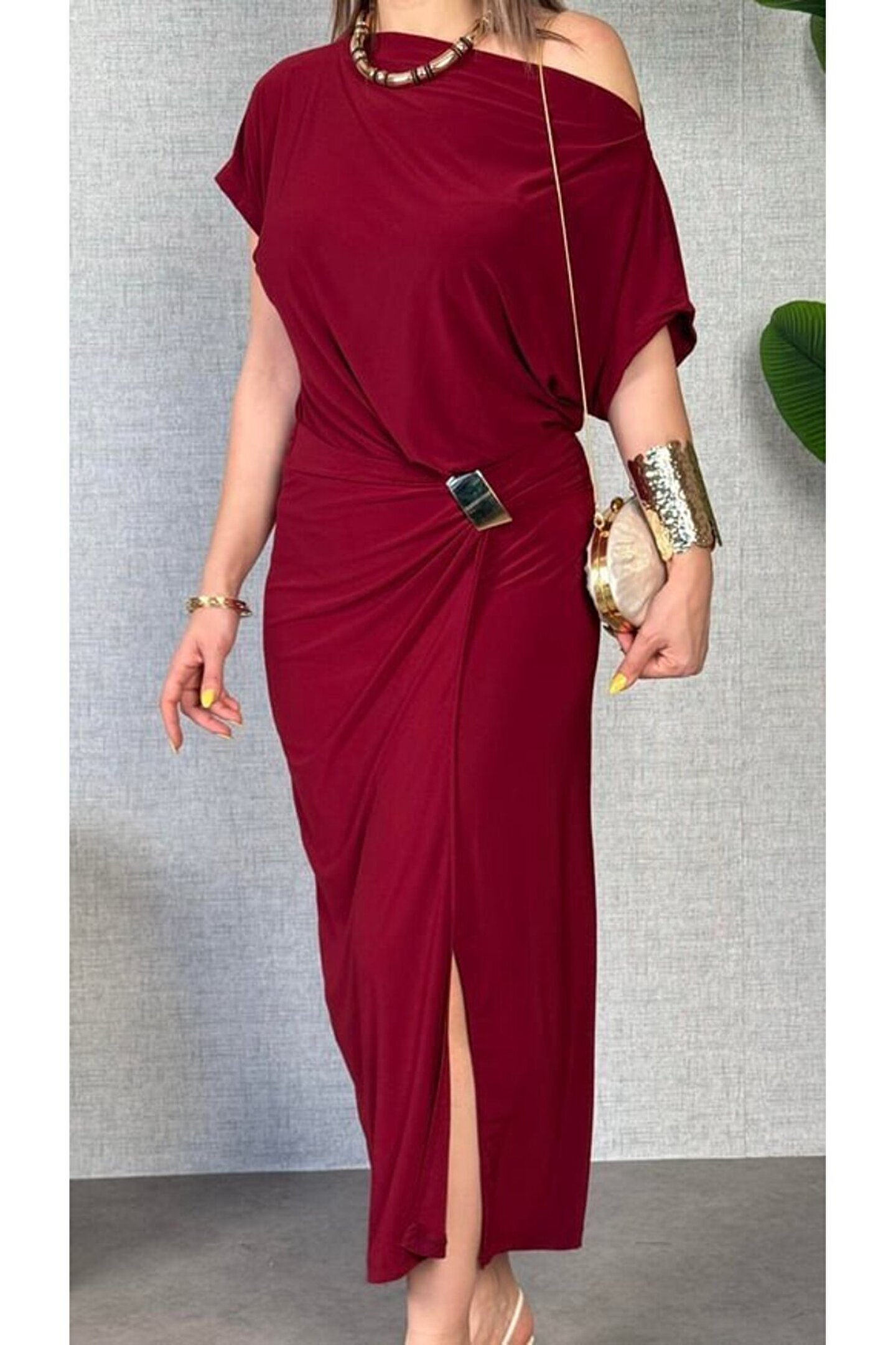 Butik Kadın Kısa Kollu Tek Omuzdan Açık Beli Lastikli Sandy Maxi Elbise