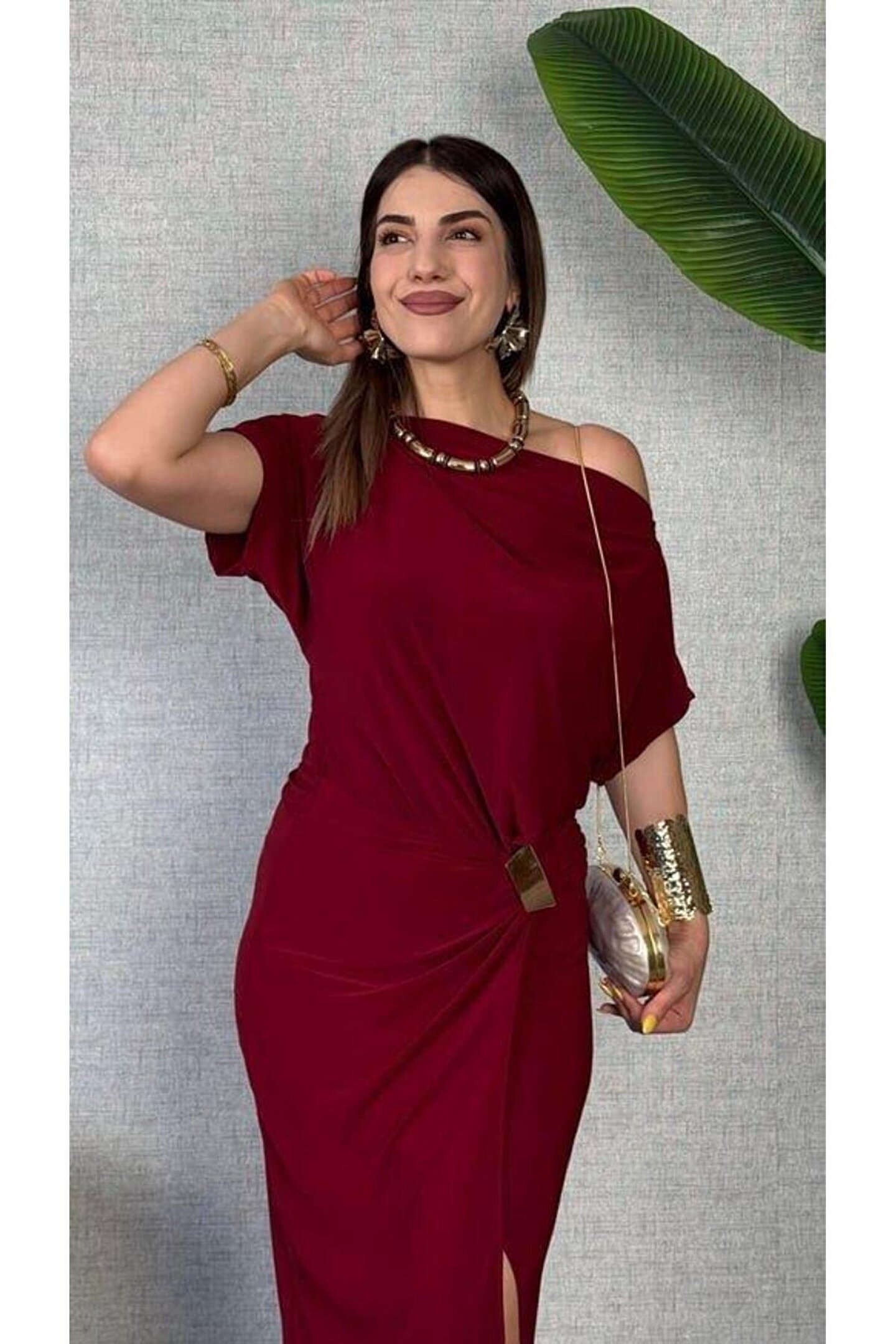 Butik Kadın Kısa Kollu Tek Omuzdan Açık Beli Lastikli Sandy Maxi Elbise