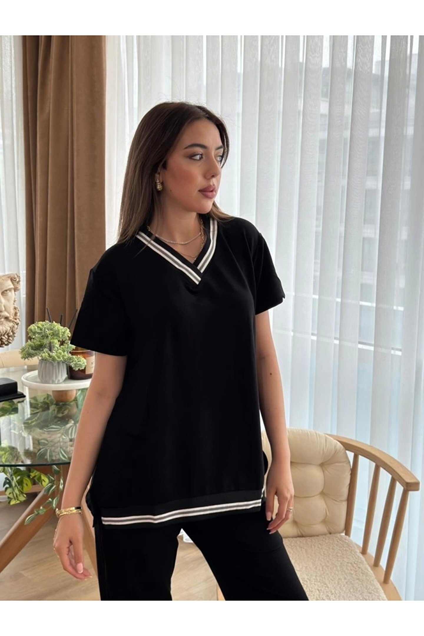 Butik Kadın Kısa Kollu V Yakalı Iki Iplik Bluz Ve Pantolon Ikili Takım