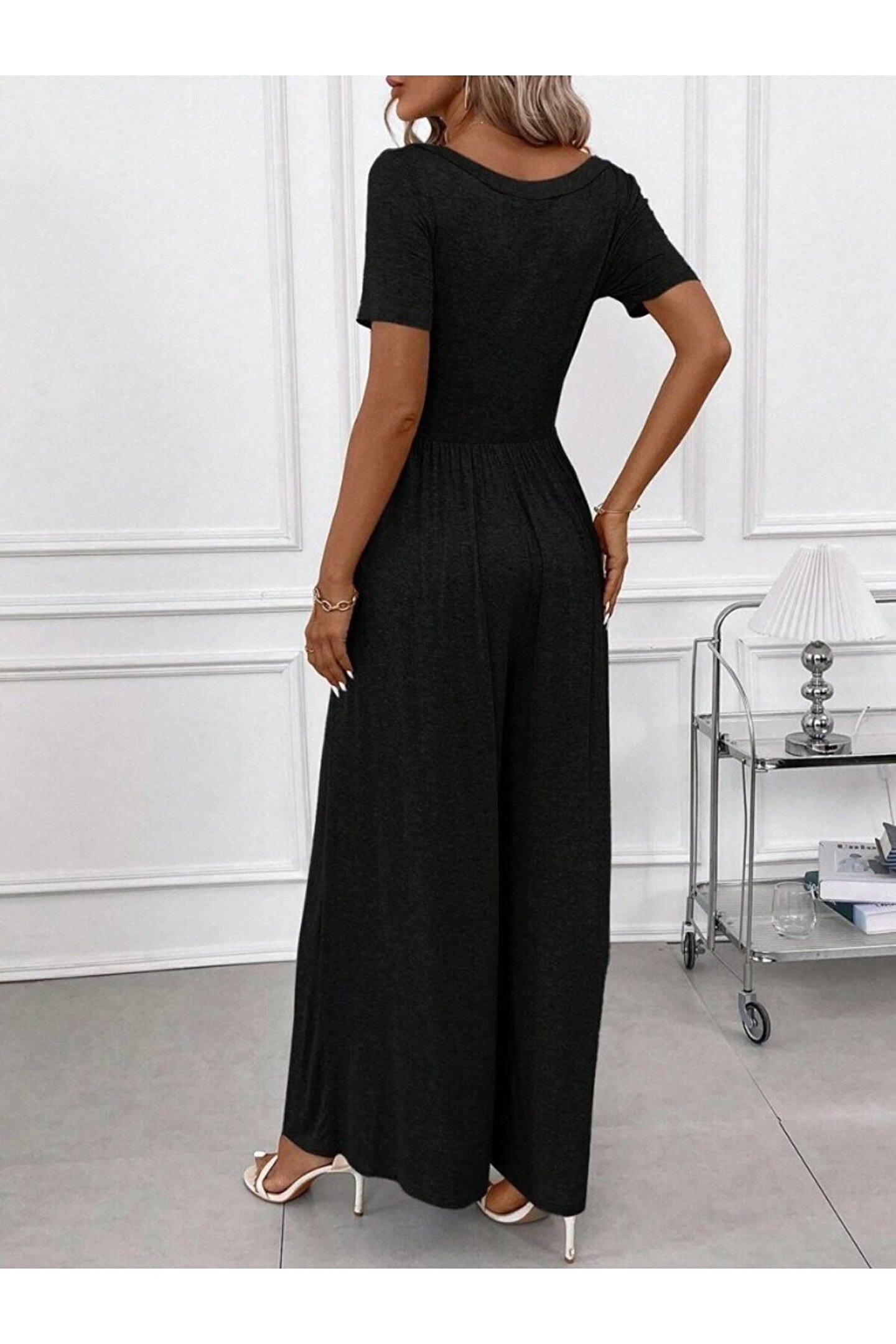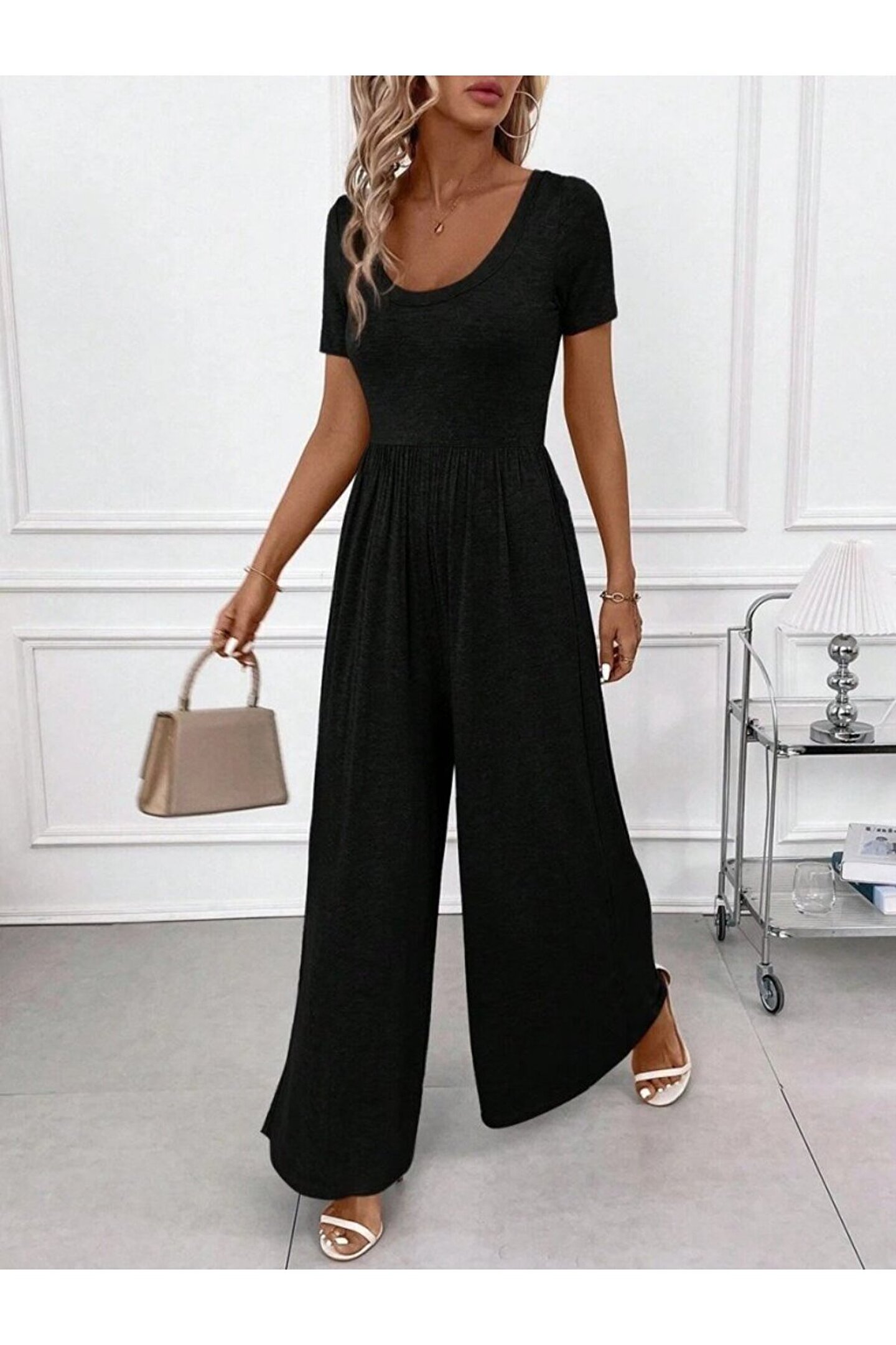 Butik Kadın Kısa Kollu Yuvarlak Yaka Geniş Paçalı Bürümcük Tulum