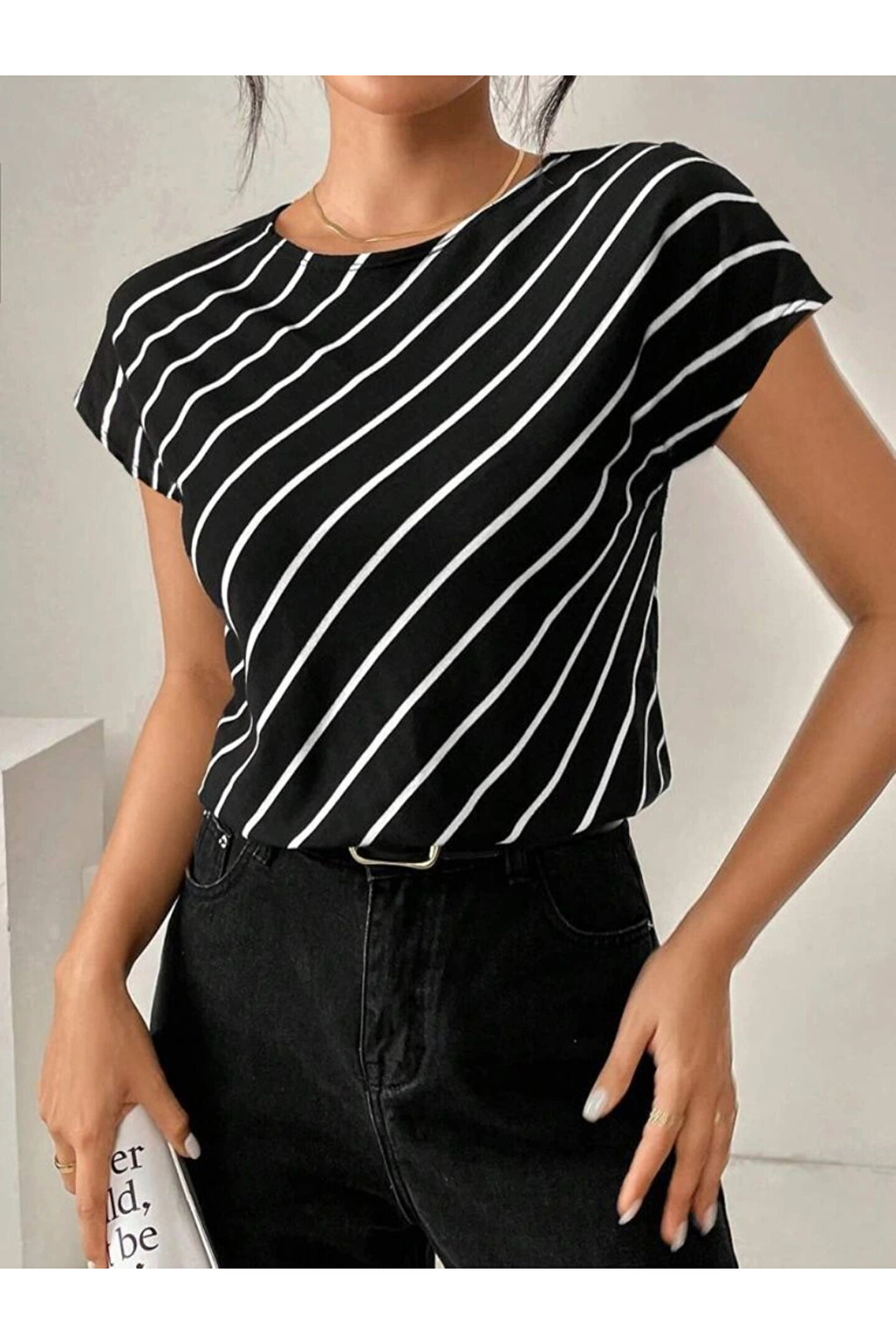 Kadın Kısa Yarasa Kollu Bisiklet Yaka çizgi Desenli Atlas Bluz
