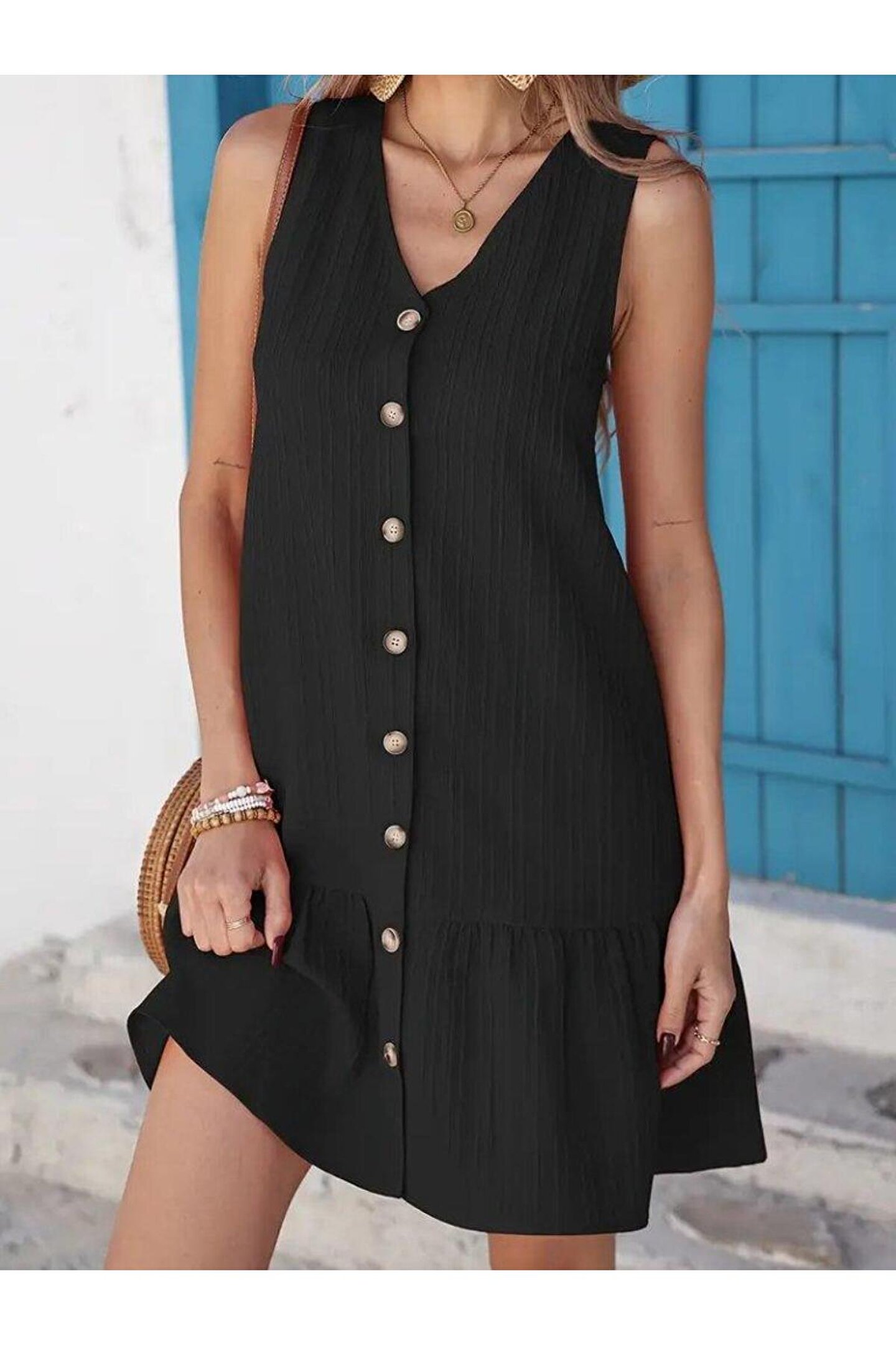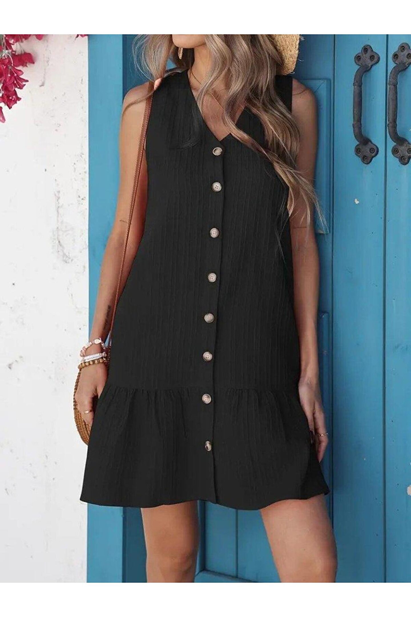 Butik Kadın Kolsuz V Yakalı önden Düğmeli Fırfırlı Narin Elbise