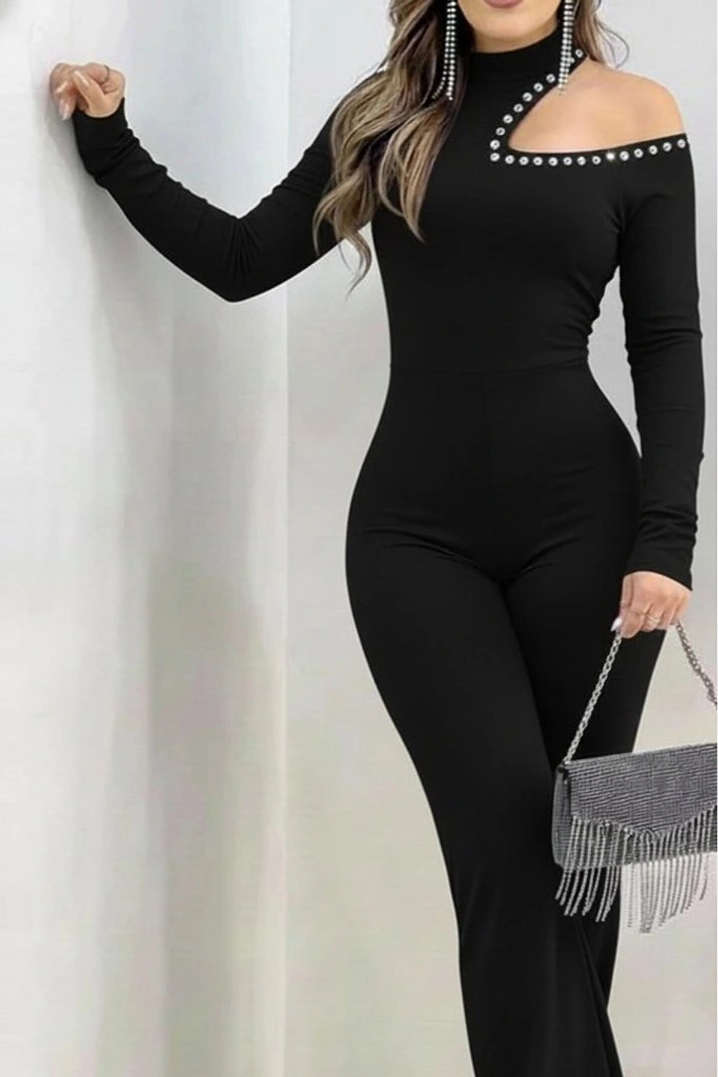 Butik Kadın Tek Omuzdan Açık Balıkçı Yaka Taş Detaylı Uzun Ithal Krep Tulum