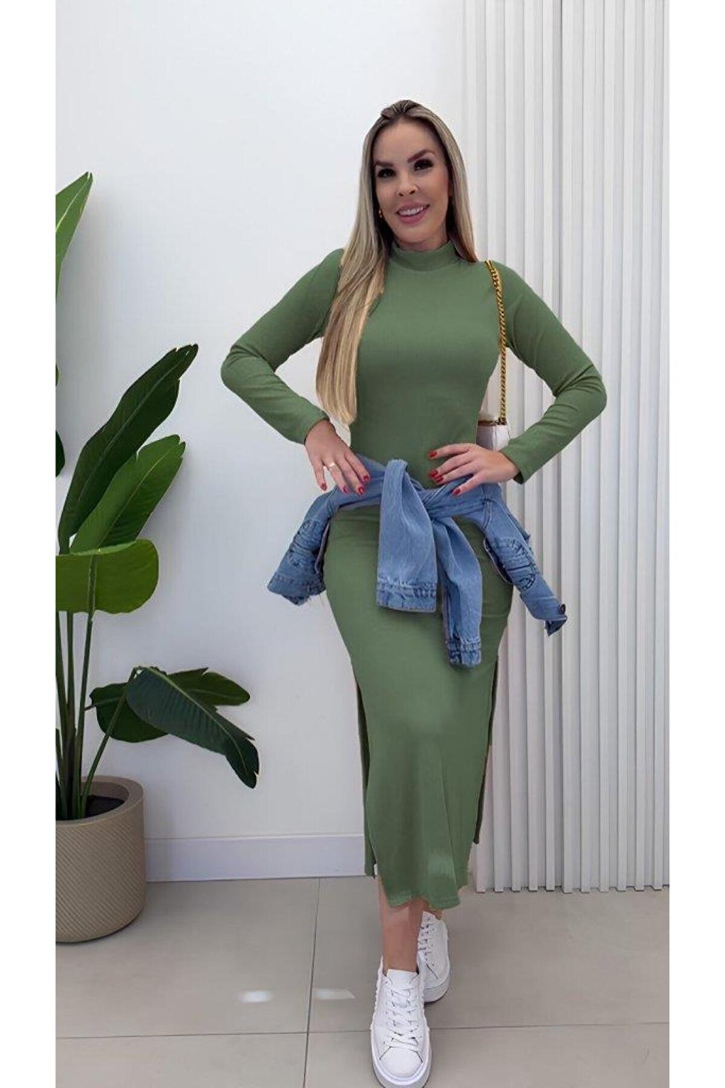 Kadın Uzun Kollu Balıkçı Yakalı Yanlardan Yırtmaçlı Kaşkorse Maxi Elbise