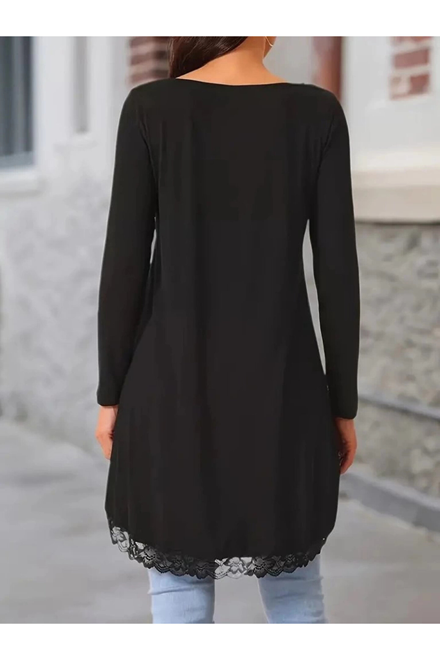 Kadın Uzun Kollu Bisiklet Yaka Asimetrik Kesim Detaylı Dantelli Viskon Bluz